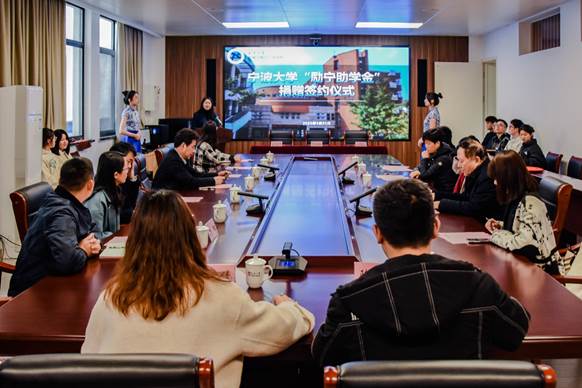 “励宁助学金”捐赠签约仪式在宗瑞航海楼501会议室举行。宁波北仑区慈善总会会长蒋素春、宁波宏达货柜储运有限公司董事长陆汉幸、宁波宏达机械制造有限公司总经理张萍和总经理励岷翰、校友办主任/校教育发展基金会副理事长兼秘书长胡宝华、学生处副处长朱燕、机械学院特聘院长阮殿波、院党委书记王智腾出席本次仪式,学工办辅导员代表和首批“励宁助学金”受助学生参加。仪式由院党委副书记沈妍伶主持。