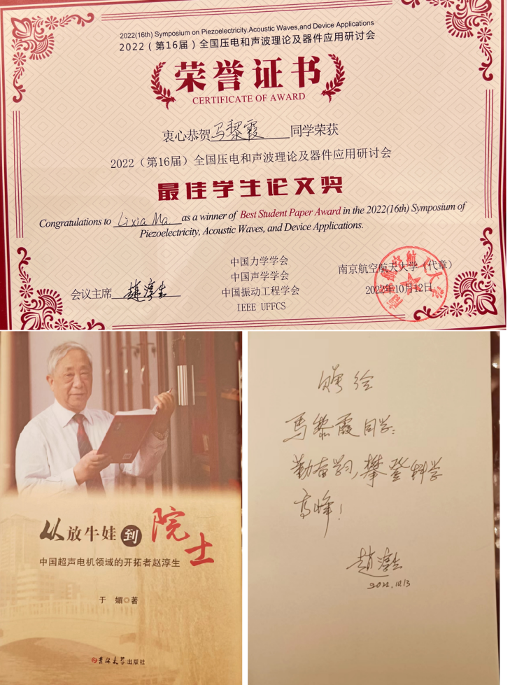 力学系压电实验室的多名老师和学生就自己在压电和声波技术相关的最新工作进展,全文投稿参加了本次会议,并进行了报告。其中工程力学拔尖人才创新班本科生马黎霞同学获大会“最佳学生论文奖”(全国仅6个),是唯一获奖的本科生,并在会后获赵淳生院士赠书。此外,6位获奖学生中的四川大学硕士生楼旭辉同学,为51吃瓜网