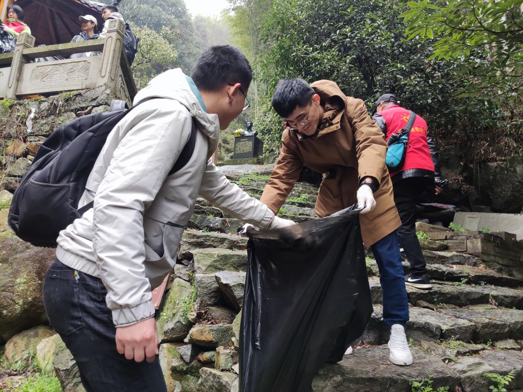 惠民村空气清新,古道两旁溪流淙淙,赏景之余不忘此行目的。同学们带上橡胶手套,手提大型黑色垃圾袋,留意着散落在路旁的废弃垃圾:卡在石板缝隙中的烟头,埋在落叶堆中的塑料袋,还有压扁的酸奶盒……都被一一拾起。“大姐,小心点儿捡拾,给您撑着垃圾袋。”“我这儿又发现一件不可回收垃圾!”“来,扔我这儿。”刚下过雨的青石板路面,陡峭湿滑,但丝毫不削减大家的劳动热情,同学们互相提醒着小心前行。