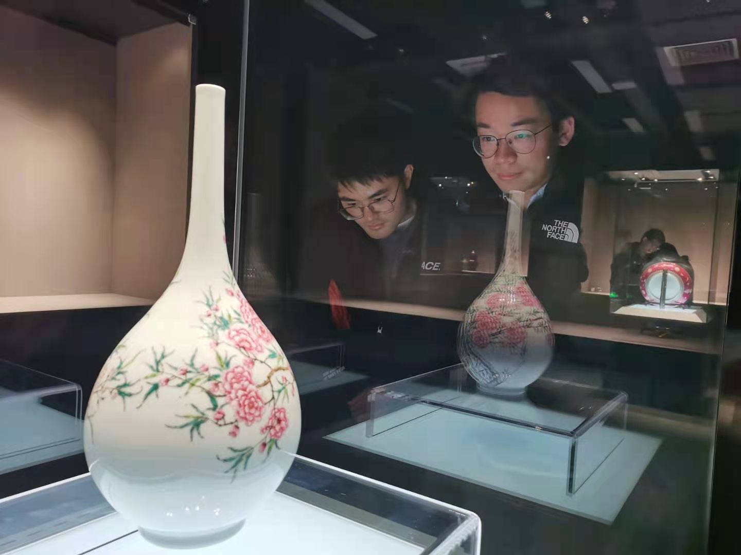 参观现场,聆听着专业的讲解,同学们纷纷围在展品两侧,仔细欣赏神韵精绝的御窑古瓷:宋代汝窑鼓钉洗,天青色泽,通体温润莹澈,可谓“雨过天晴云破处”,最与自然接近的淡雅色调,尽显宋代“天人合一”的审美情趣。元代龙泉窑荷叶盖罐,上半部呈现流畅的荷叶曲线造型,下半部圆润端庄,整体器型颇为大气。最为吸睛的是清代乾隆珐琅彩九龙盘,一龙居中,八龙环绕,整体釉地紫红,色彩明艳。作为清代御用瓷器,珐琅彩不愧为“世界上最奢侈的艺术品”。