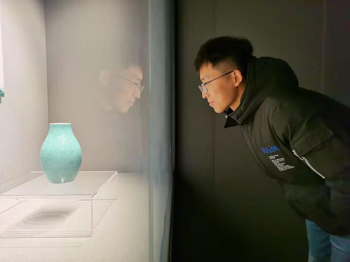 一小时的参观时间很快就过去了,大家离开前还犹有不舍,纷纷讨论自己的观感,机械专业的孙江浩同学表示自己印象最深的是宋钧窑长颈瓶,窑火造成的缺陷反而造就了另类的美,窑变带来的颜色代表着一种祥瑞,充满着变化美。卢鹏飞同学说自己很有感触,各朝代的瓷器都这么炫耀夺目,有一件展品是用象牙雕刻的白菜,细节很有深度,菜上昆虫刻得栩栩如生,完美精致。王帅同学说自己很幸运也很感谢学院预约到了开馆第一天的参观资格,他认为清朝瓷器虽精妙绝伦、巧夺天工,但大都过于华贵堂皇,相比之下更喜欢宋元时期瓷器的清新素雅。