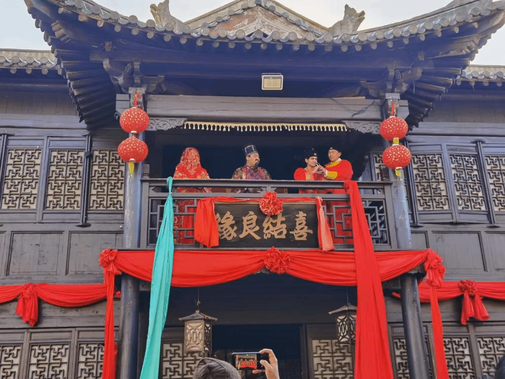 在象山影视城工作人员的引导下,国际学生开启了探索之旅。路过襄阳城,恰逢传统节目上演——抛绣球招婿。留学生们纷纷加入其中。最终,一名孟加拉国男生,勇夺绣球,拔得头筹,并与演员完成了中国传统的拜天地环节。留学生们的参与也吸引了大量游客围观参与,场景热闹非凡。