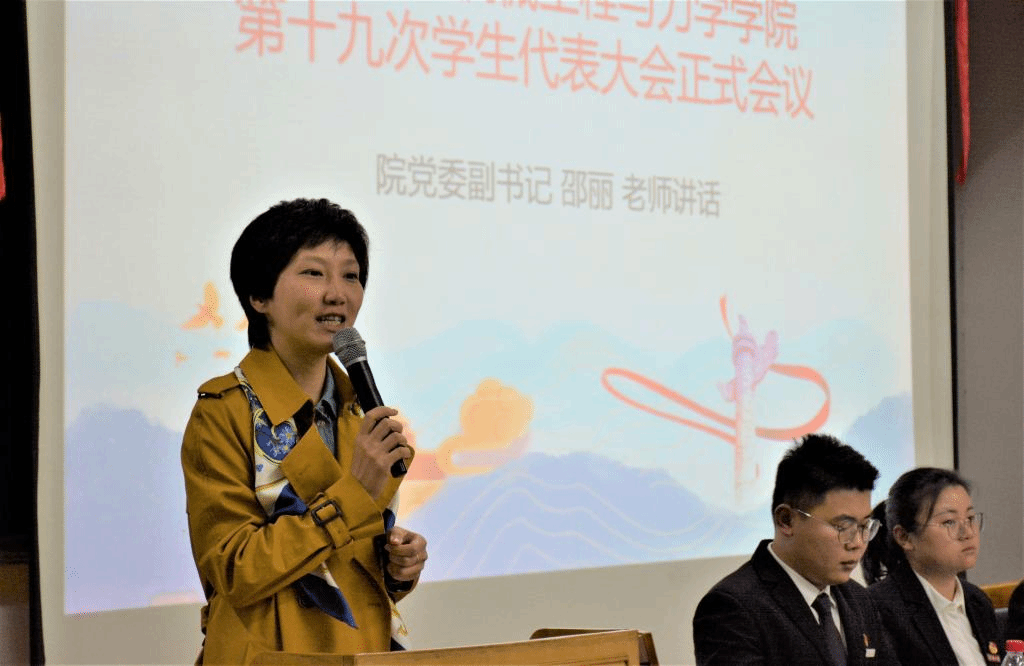 一年来的团学工作表示肯定。她指出,一年来,学院团学组织围绕中心、服务大局,主动贴近青年,在思想引领、校园文化、社会实践、志愿服务、创新创业、服务青年教师等方面做了大量卓有成效的工作,形成了许多新亮点。她强调,青年是国家和民族的希望,实现中华民族伟大复兴“中国梦”的责任,不在他人,全在青年。她希望青年学生把握历史际遇和机缘,坚定自信、增强自觉,勇做走在时代前列的奋进者、开拓者、奉献者。邵丽老师鼓励机械青年积极进取,并向青年提出了三个问题:我要成为一个什么样的人?我要怎样成为这样的人?我要为谁成为这样的人?以此激励青年坚定信念、找准人生航向,勇于担当、书写不朽青春。