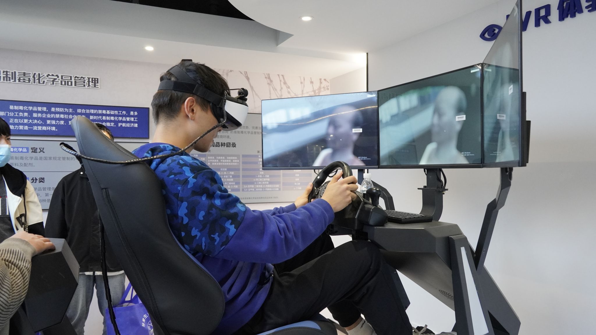 随后,在知识竞答和体验环节,同学们在知识测试区科学系统学习了毒品预防教育知识,还通过人脸变化系统、光影身体伤害系统以及毒驾模拟系统真实地感受了吸食毒品对人体造成的伤害,更为真切地体会到了毒品的危害以及禁毒的重要意义。