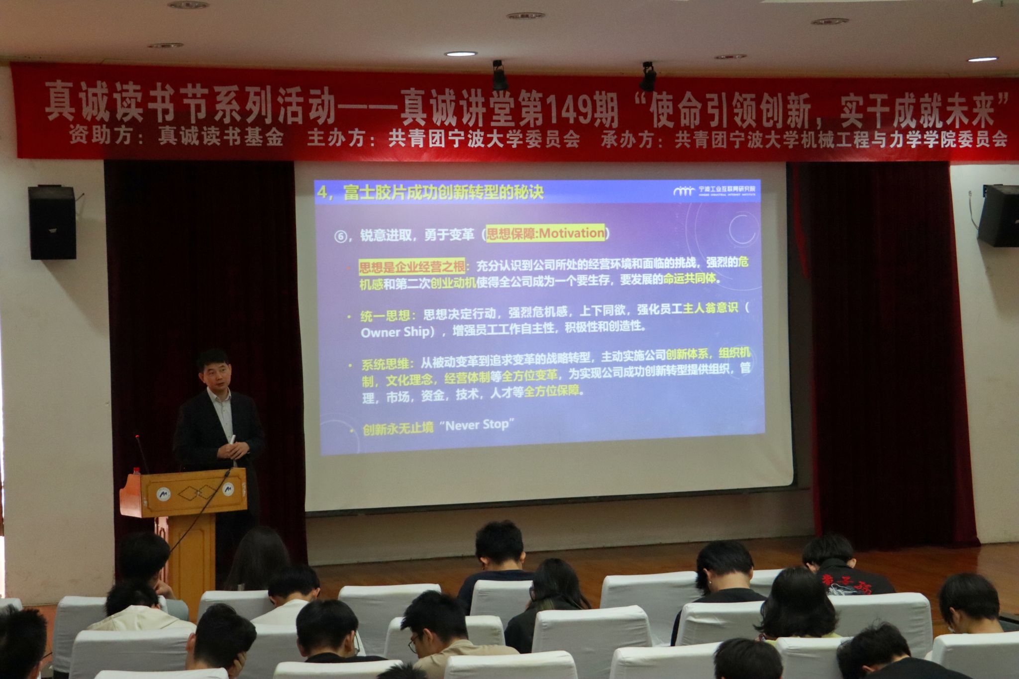 在绣山工程楼三楼报告厅举行了真诚读书节系列活动——第149期真诚讲堂“使命引领创新,实干成就未来”,邀请宁波工业互联网研究院副院长、日本华侨华人博士协会名誉会长葛宗涛教授现场分享。