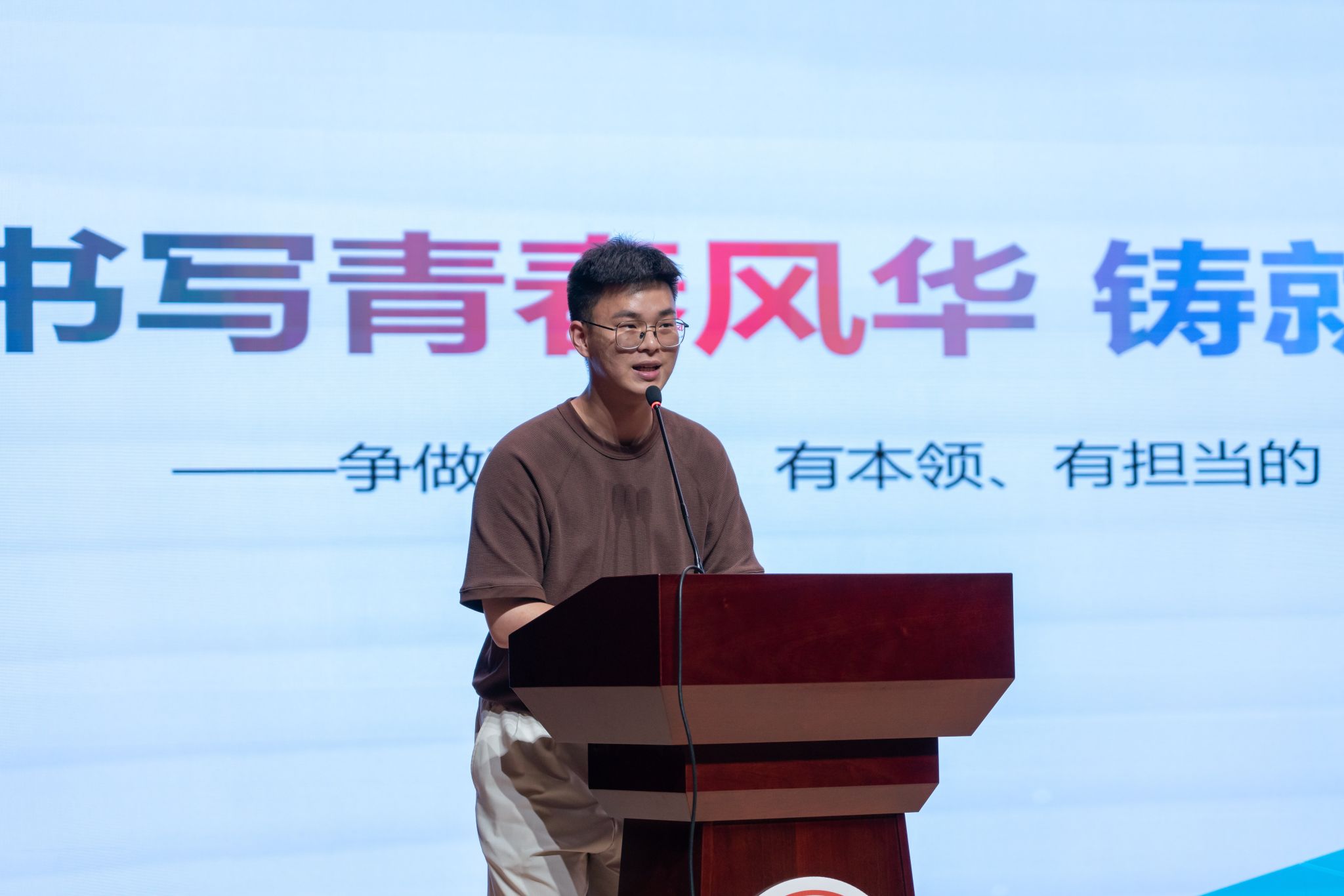 在班主任代表发言环节,237机械国贸班班主任施晨淳作为班主任代表上台分享了自己的教育理念和管理经验,表达了对同学们的殷切期望和关怀之情。他鼓励分流新生们要积极主动,勇于面对挑战,珍惜与同窗共度的大学时光。