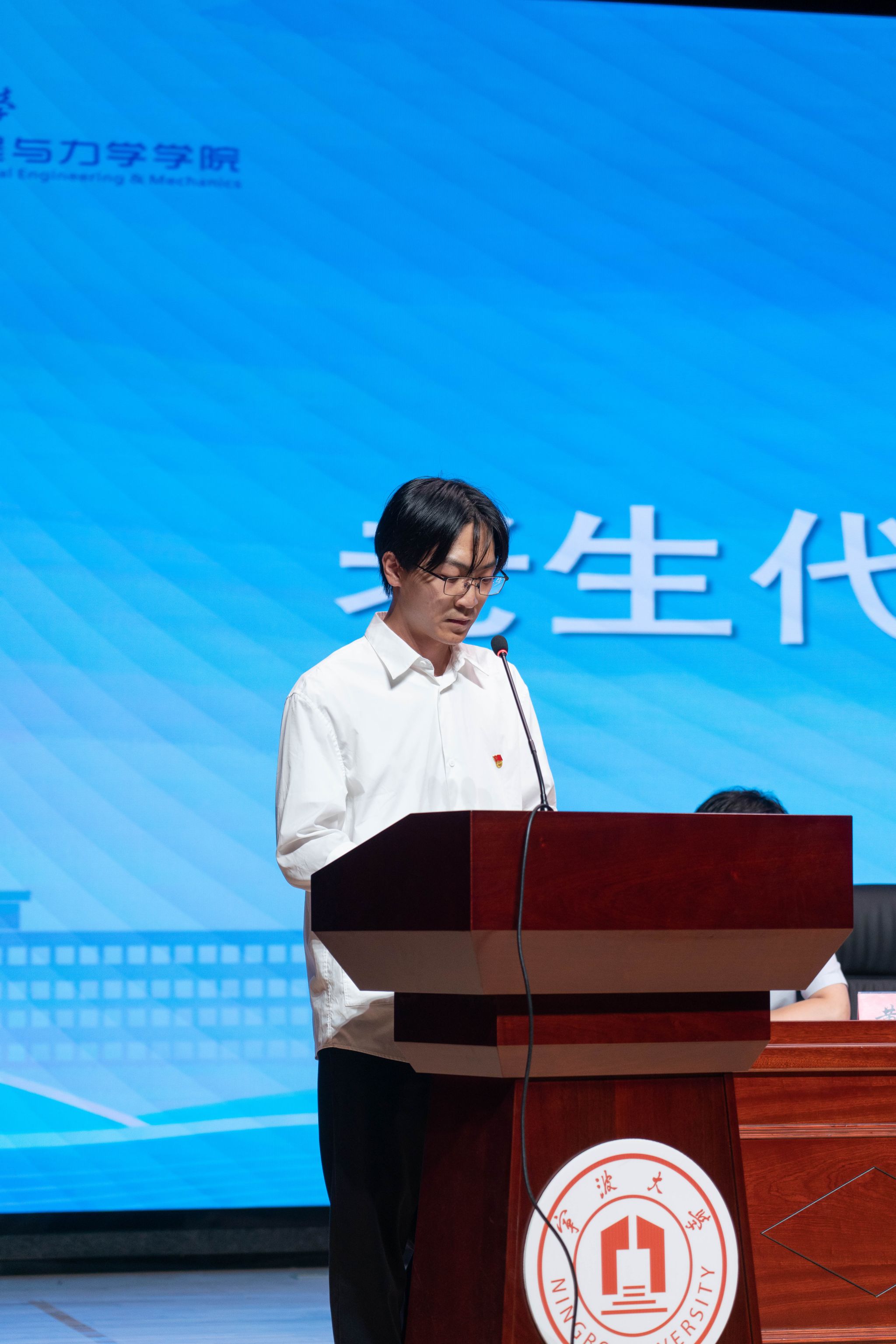 紧接着,来自213工程力学(拔尖人才创新班)的班长王瑞和来自237机械国贸班的班长邹子龙作为新老生代表分别上台发言。王瑞以自己的亲身经历为例,向分流新生们传授了学习方法和生活经验,鼓励他们在大学期间全面发展自己。邹子龙则表达了对大学生活的期待和憧憬,表示将珍惜机会,努力学习,为学院争光。