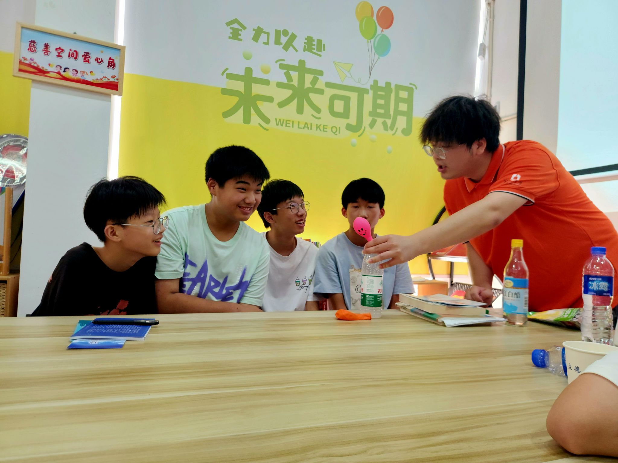 “你见过快速充气的气垫吗?在惊讶充气的迅速时,有没有想过它是怎么实现的呢?”“在塑料瓶中装入适量白醋,在气球中装入小苏打粉末,并快速套在瓶子上,就得到了一个‘会生气’的瓶子。”在墙头镇便民服务中心,团队成员和社工部共同开展了“小小科学家,一起来实验”活动,将“实验室建到家庭”,本着兴趣为主的原则,请同学们自由选择实验主题并准备器材,分组教学后团队作战,1小时内将7个原定实验全部完成。从理解到参与,在身体力行中激发了小朋友们的想象力和好奇心,也种下了“爱科学”的种子。