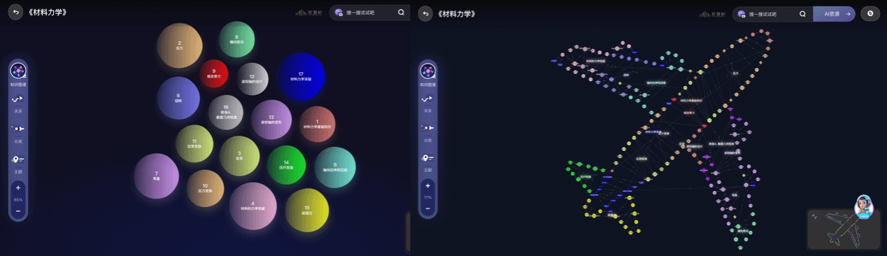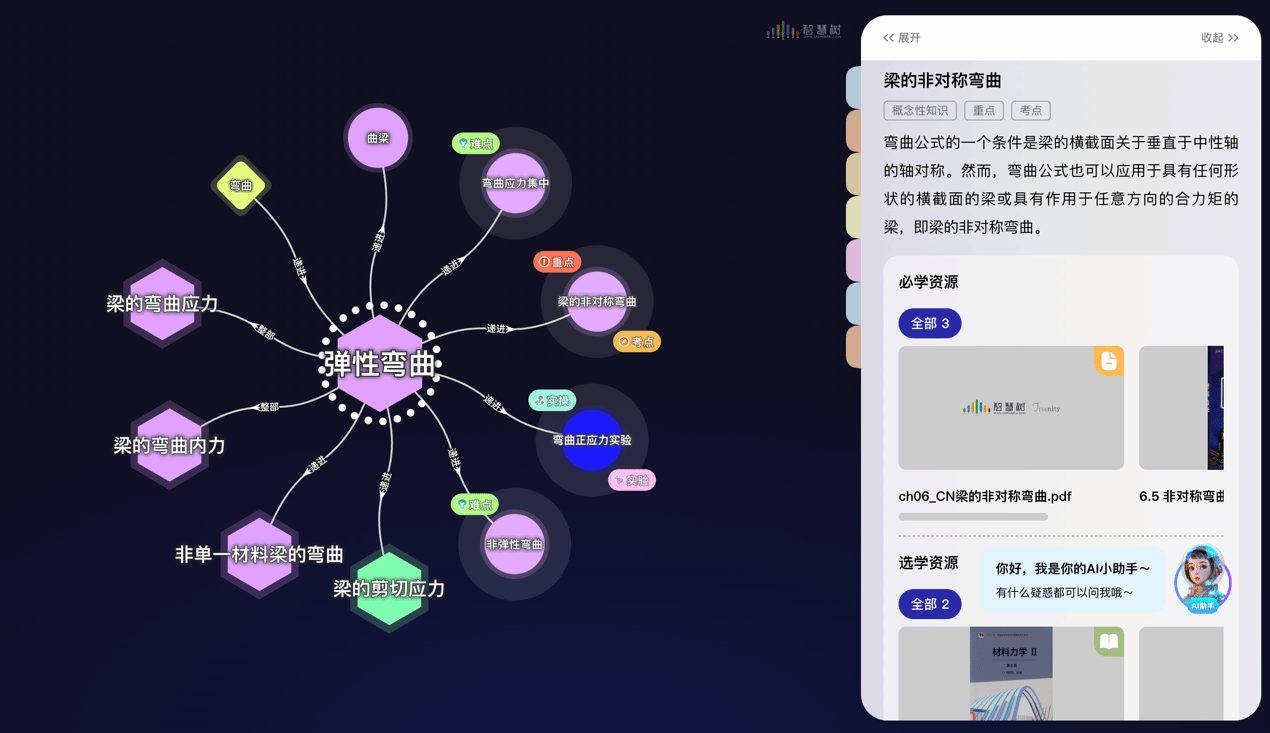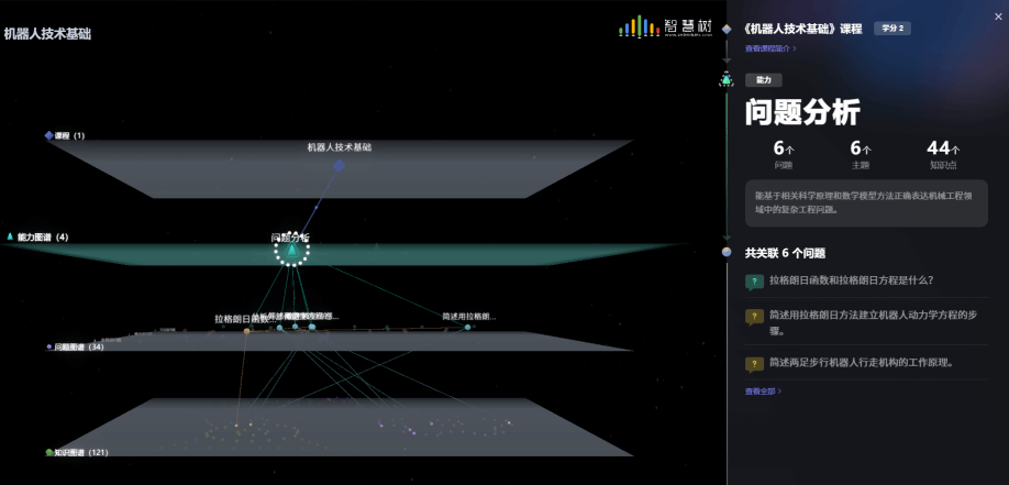 将人工智能与教学内容深度融合,首批建设《理论力学》、《材料力学》、《机器人技术基础》 等3门知识图谱AI课程,通过对课程知识点进行体系化梳理,形成完整的知识结构体系,并与课程特色相结合,进行可视化呈现。该课程体系不仅涵盖了机械工程与力学领域的核心理论和应用技术,还通过智能化的教学手段,提高了教学效率和学生的学习兴趣.