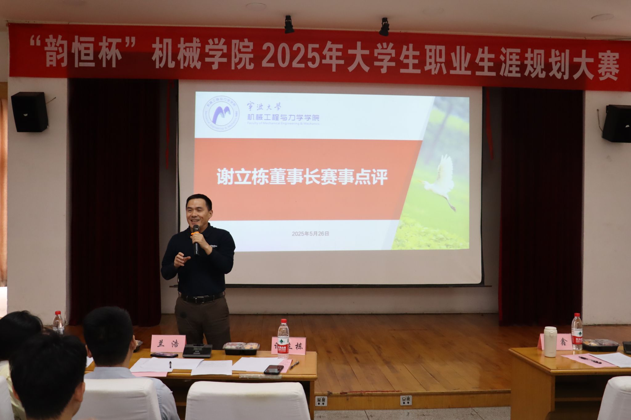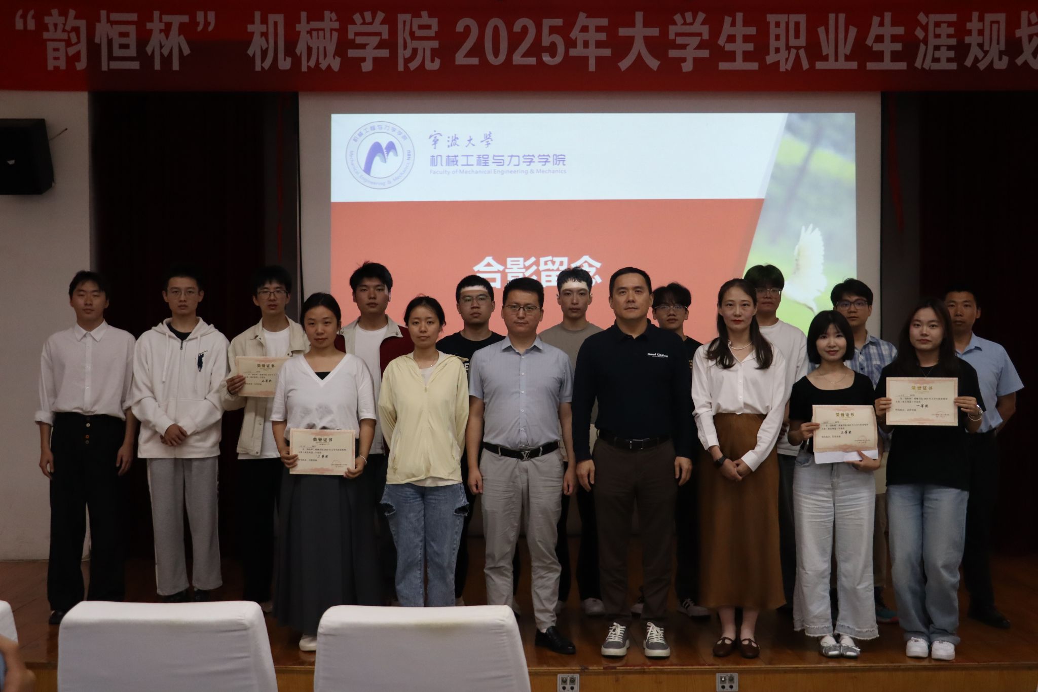 为深化产教融合育人机制,凝聚校友育人合力,5月26日,"韵恒杯"机械学院2025年大学生职业生涯规划大赛暨校级选拔赛在绣山工程楼三楼报告厅举行。捐赠方、机械学院1993级校友、宁波韵恒智家科技有限公司董事长谢立栋,宁波敏实汽车技术研发有限公司招聘经理赵鑫,机械学院2014级校友、就业兰途创始人兰浩,学院学工办/研工办主任洪松和院团委副书记潘婧等嘉宾老师出席活动并担任大赛评委。来自学院各年级的140余名同学现场观看。本届赛事从赛事筹备、选手指导到现场评审,处处彰显机械校友反哺母院的赤子情怀。