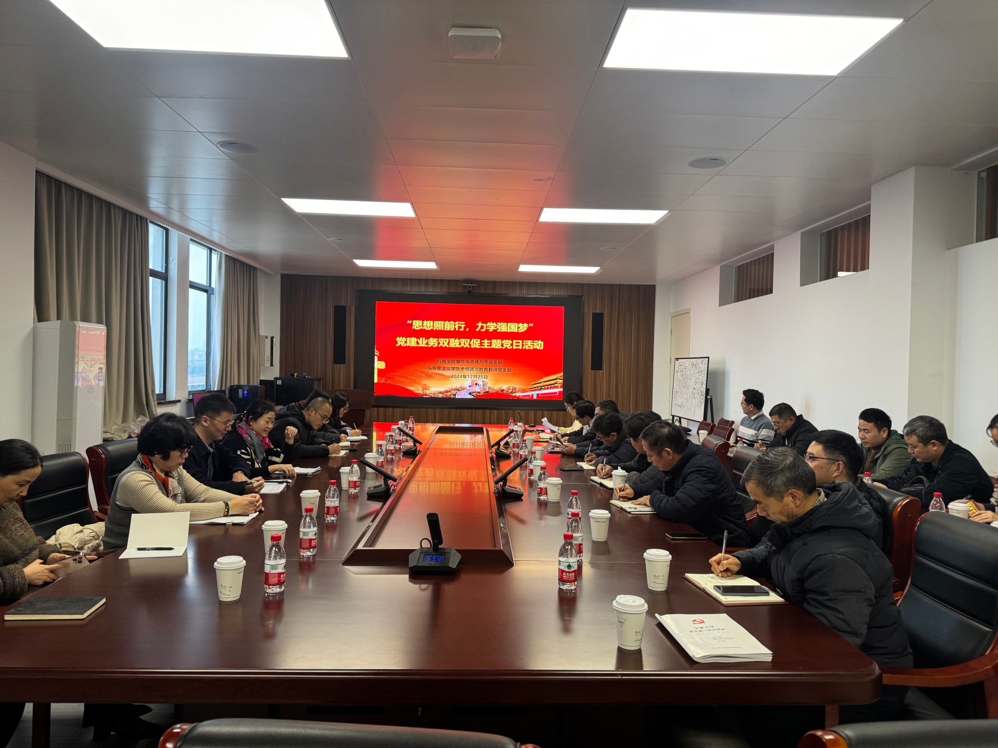 12月25日下午,为全面贯彻落实新时代党的建设总要求,深入学习习近平总书记在纪念乔石同志诞辰100周年座谈会上的重要讲话精神,以“思想照前行,力学强国梦”为主题的党建业务双融双促党日活动于宗瑞航海楼501会议室拉开序幕。马克思主义学院思想政治教育教师党支部成员和我院爆炸与流体力学教师党支部成员参与活动,“强国行”专项行动负责人、爆炸与流体力学教师党支部书记王永刚主持活动。