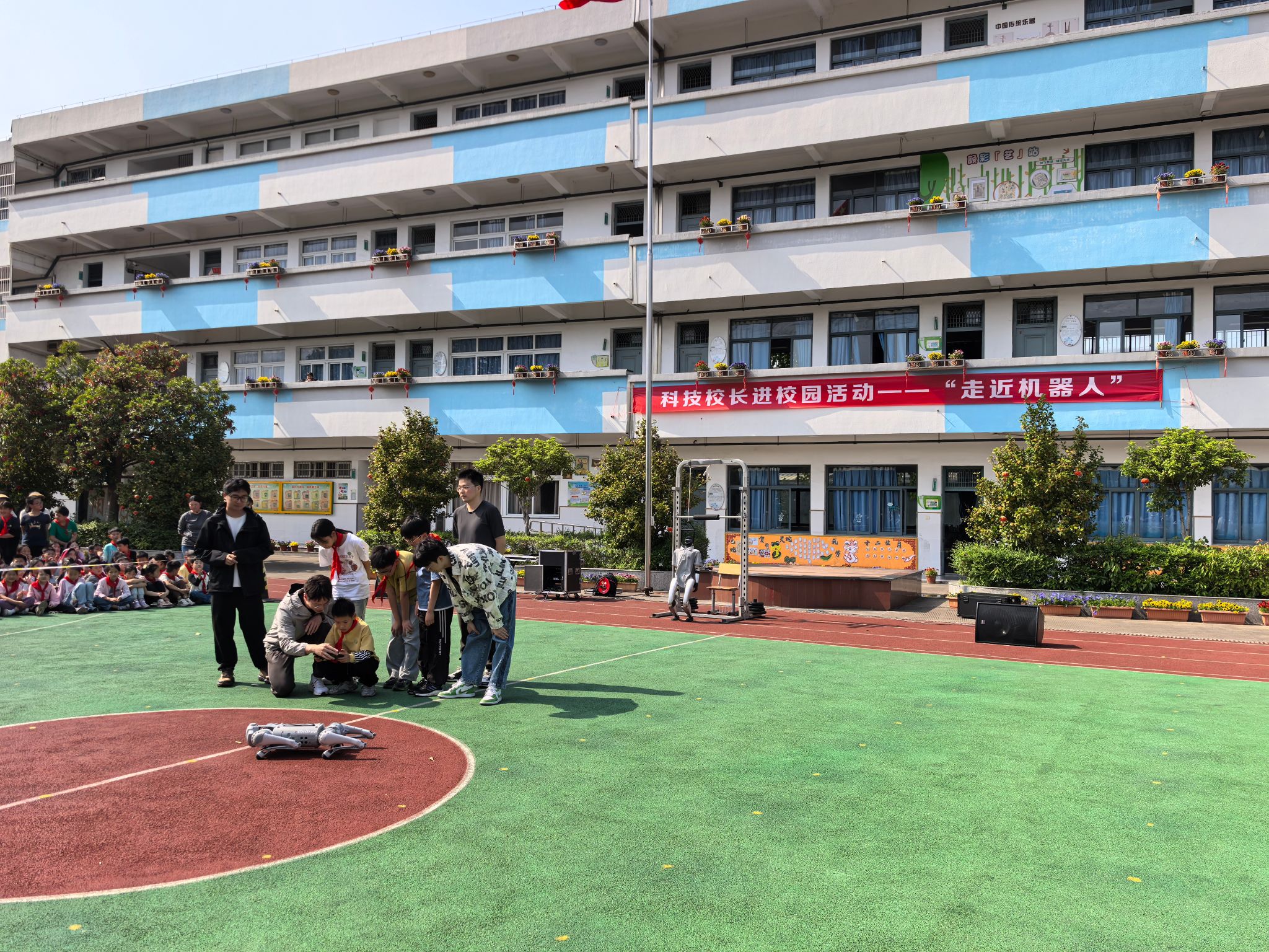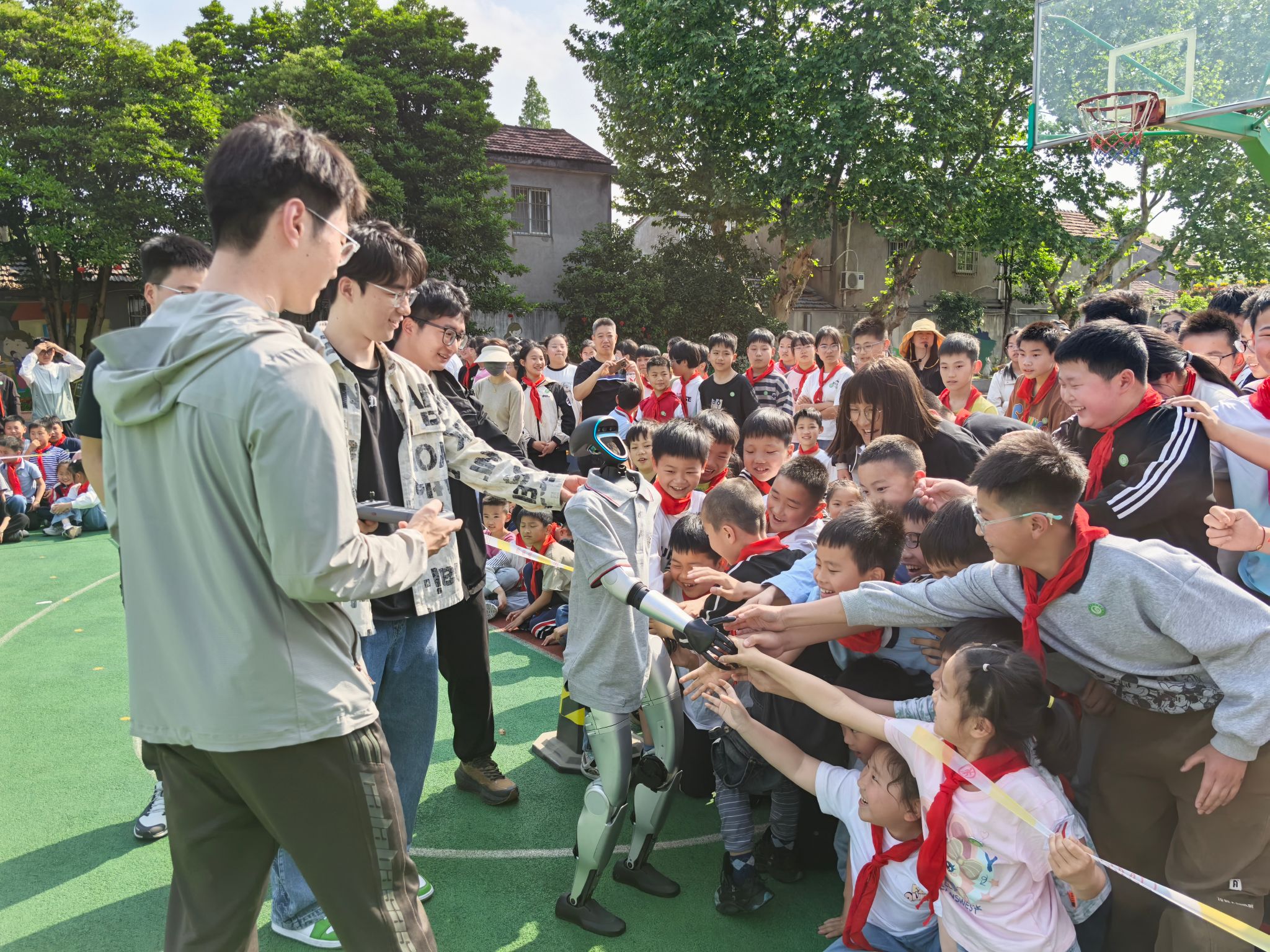 在科普活动中,科普团队为尚德学校全校师生讲解四足机器人、人形机器人相关知识,演示四足机械狗、人形机器人的各种功能和酷炫动作,并指导同学们亲身操作四足机械狗,以及与人形机器人握手互动,向同学们展示了现代机器人技术的魅力,激发了同学们对科技创新的浓厚兴趣,活动现场气氛活跃,科普教育成效显著。