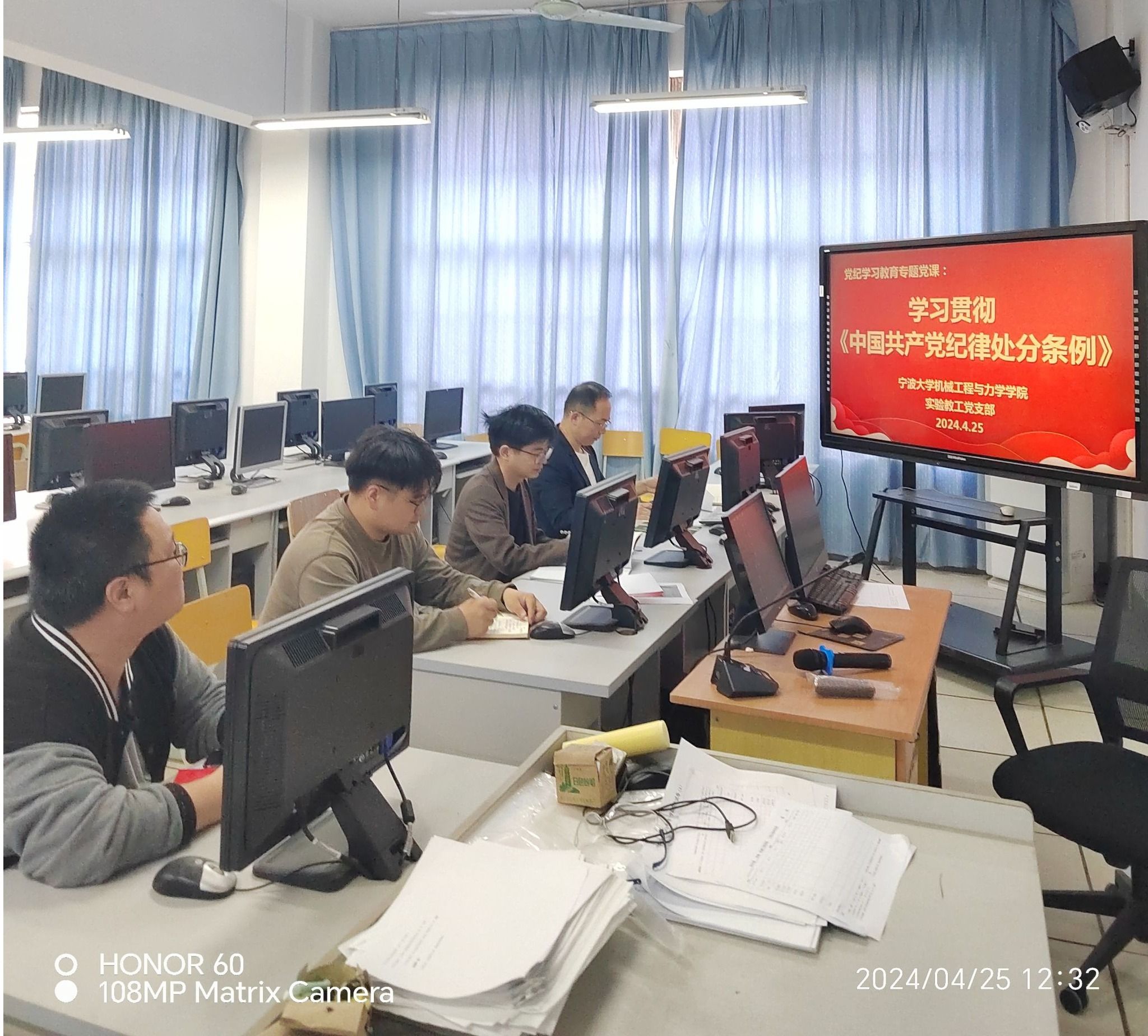 4月25日中午,机械学院实验教工党支部组织党员在机电工训中心二楼机房召开集中学习会,集体学习《中国共产党纪律处分条例》。
