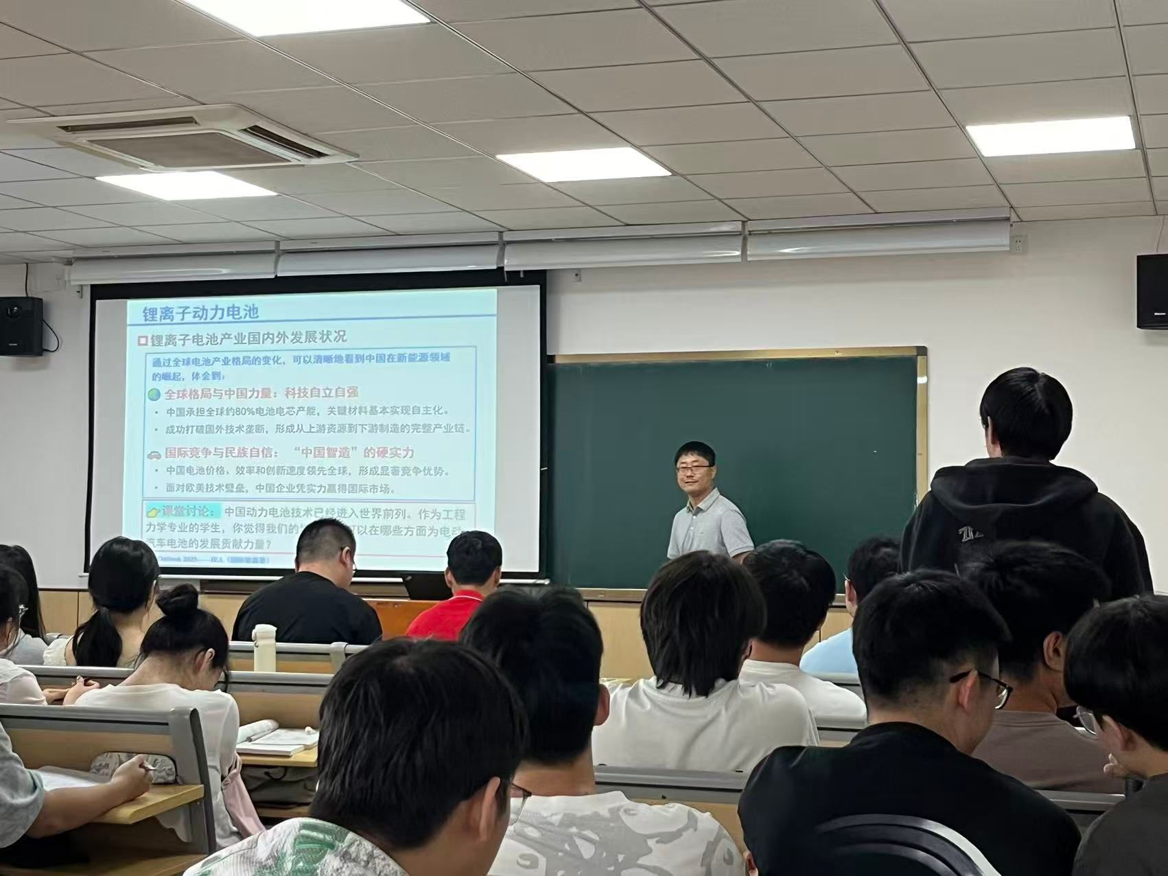 张爱兵老师从锂离子电池的结构与工作原理讲起,逐步延伸到其充放电特性,随后以“中国锂离子电池产业的崛起与科技自立自强”为主题,分析了我国锂离子电池技术与电动汽车产业发展的内在联系,并与同学们探讨了力学知识在锂离子电池性能优化与安全设计中的重要作用。通过案例分析与数据对比,学生不仅加深了对力学专业知识的理解,也增强了以专业所学服务国家科技发展的使命感与责任感。课程尾声,张老师就同学们提出的问题进行了细致解答。