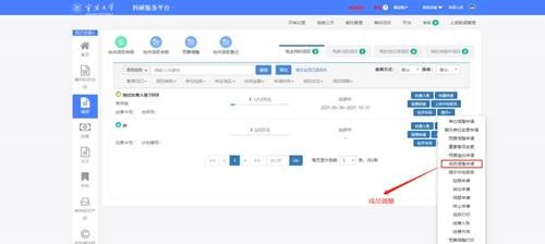4. 进入项目组成员,请确认成员是否完整。特别是项目中有学生的参与的,请完善学生身份类别。成员信息有问题的,进入科研系统首页,左侧的项目界面,点击操作下拉框下的成员调整申请,进入成员调整界面进行添加和修改,待项目主管审核之后,会自动补充到项目经费公开一览表,最后再提交即可。