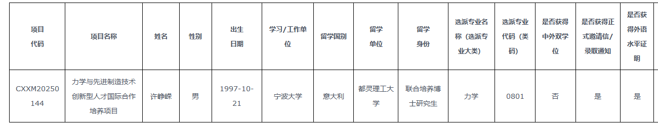 根据国家留学基金管理委员会《关于做好2025年创新型人才国际合作培养项目第二批人员申报工作的通知》的有关要求,机械工程与力学学院组织开展了对已获批创新型人才国际合作培养项目的人员申请工作。按照“公平、公正、公开”的原则,经个人申请、学院推荐许峥嵘申请2025年创新型人才国际合作培养项目,公示如下: