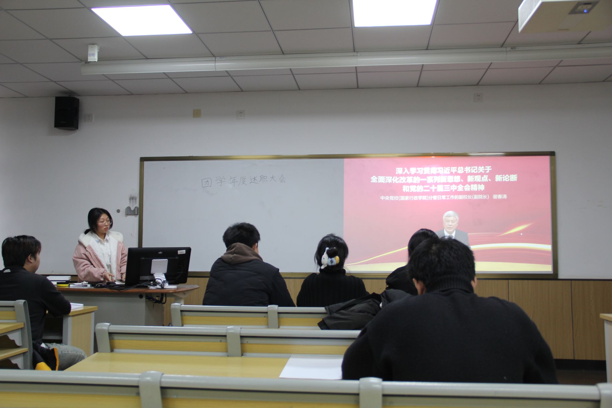 谢格老师紧接实事,向在座的学生干部们解读党的二十届三中全会精神,强调团学干部要加强理论学习,了解全会重要成果,做到理论学习和日常工作相结合,有目标有信仰,推动团学队伍全面发展。大会最后,潘婧老师对此次述职大会做出了总结,团学干部应该牢记使命,加强团队协作,围绕中心工作服务同学成长,打造特色团学工作品牌。