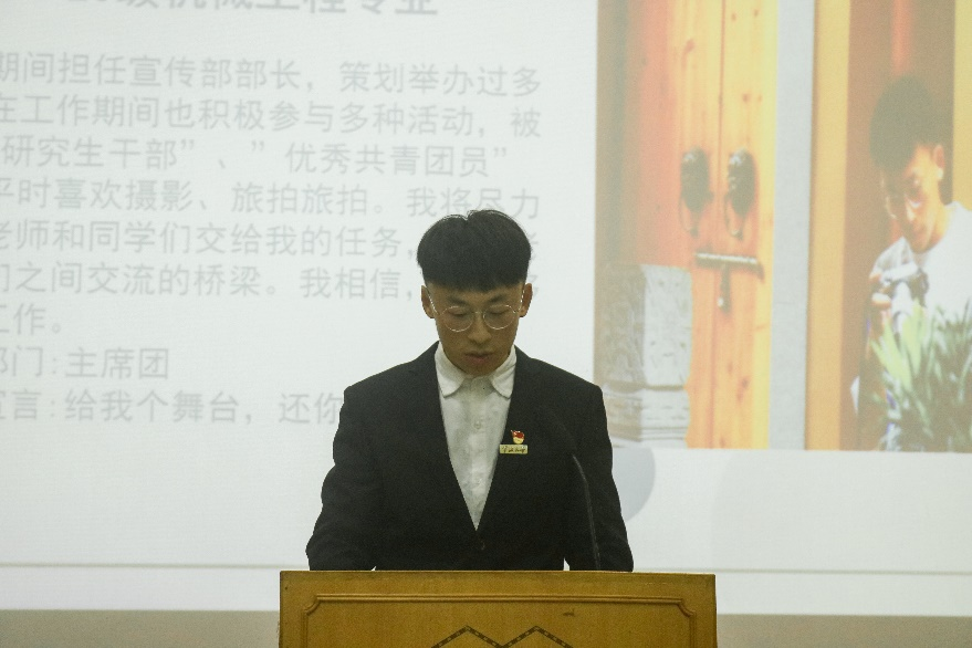 大会选举阶段,33位候选人依次进行了精彩的竞选演说。每位候选人就个人基本情况、加入研究生会的初衷以及未来的工作设想等方面向代表们做了汇报,并表达了自己想加入研会的愿望,展现了机械学子优秀的素质和良好的风貌。