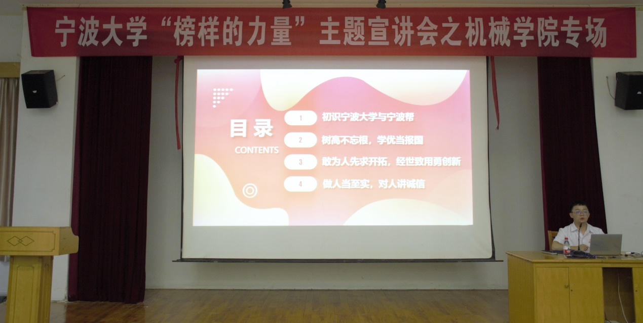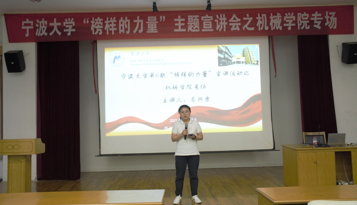 在中国共产党成立100周年之际,为进一步推动我院大学生思想政治教育工作,积极引导青年学生树立远大理想、确立学习目标、做好生涯规划,激励广大青年学子勤奋学习、增长才干、自立自强,着力营造敦厚奋进、崇教尚学的良好风气,6月9日,宁波大学第六期“榜样的力量”宣讲活动之机械专场在绣山工程楼三楼报告厅拉开帷幕,宁波大学校史馆讲解队副队长、宁波大学校团委学生兼职副书记、2021届浙江省本科优秀毕业生龙兴康担任宣讲人,机械学院130余名本研学生到场聆听。