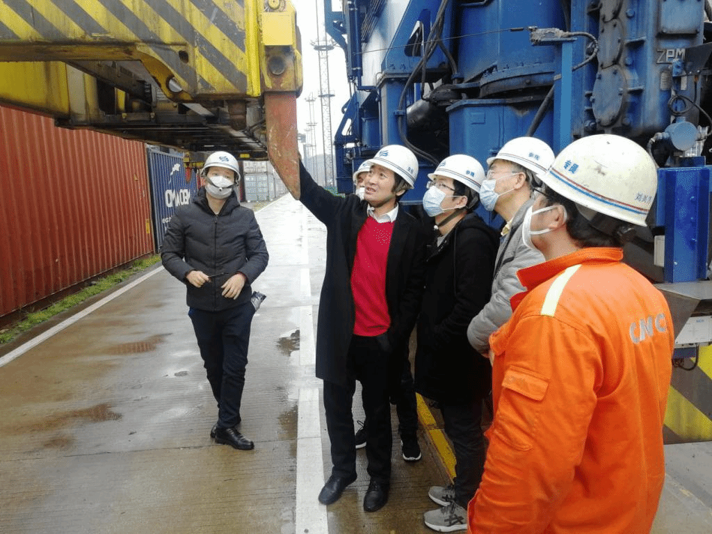 讨论结束后,刘达主任带领实验室团队到大榭码头实地参观了码头吊车的运行情况,现场介绍了传感器在集装箱吊车上的具体安装和使用细节,观察了装卸过程中的振动和冲击相关部件的具体工作环境,为后续进一步的实验测试工作进行准备。据介绍,码头的大型吊装设备在多个关键位置存在振动过于严重的问题,通常影响工作效率、造成关键部件的损坏,是码头自动化和智能化过程中的棘手问题。针对这些问题,压电实验室团队将从振动分析开始,提供可靠的解决方案。在解决问题的过程中将根据需要进行振动测试,精准确定振动状态参数和结构参数,尽可能完成准确的隔振系统设计。目前大榭码头提出的需要开展研究的部件除了传感器外,还包括机电设备箱等关键装置和部位。这些问题的解决,对加快码头设备的自动化和智能化,提高生产效率,有着重要意义。