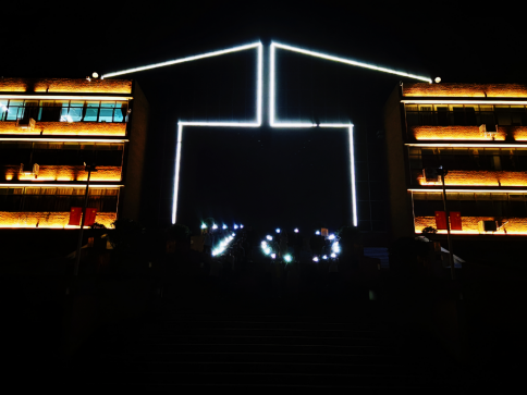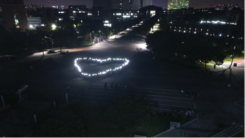学子庆祝新中国成立70周年的主题。当天晚上,在南天门及包玉书广场,同学们手持手机闪光灯摆出“70”“♡”造型,与黑夜中的南天门相呼应,仿佛心中最深沉的告白。