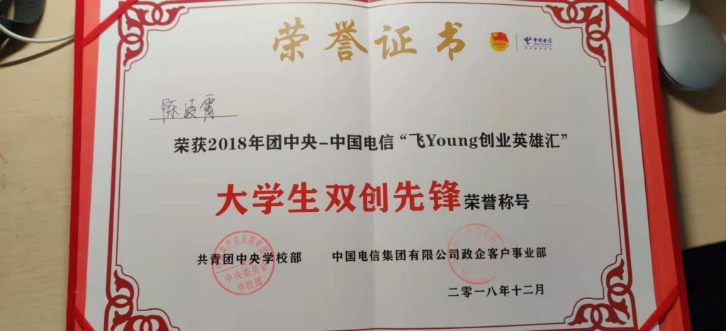 近日获悉,机械工程与力学学院陈凌霄同学在2018年团中央——中国电信“飞Young创业英雄汇”活动中,荣获“大学生双创先锋”荣誉称号。