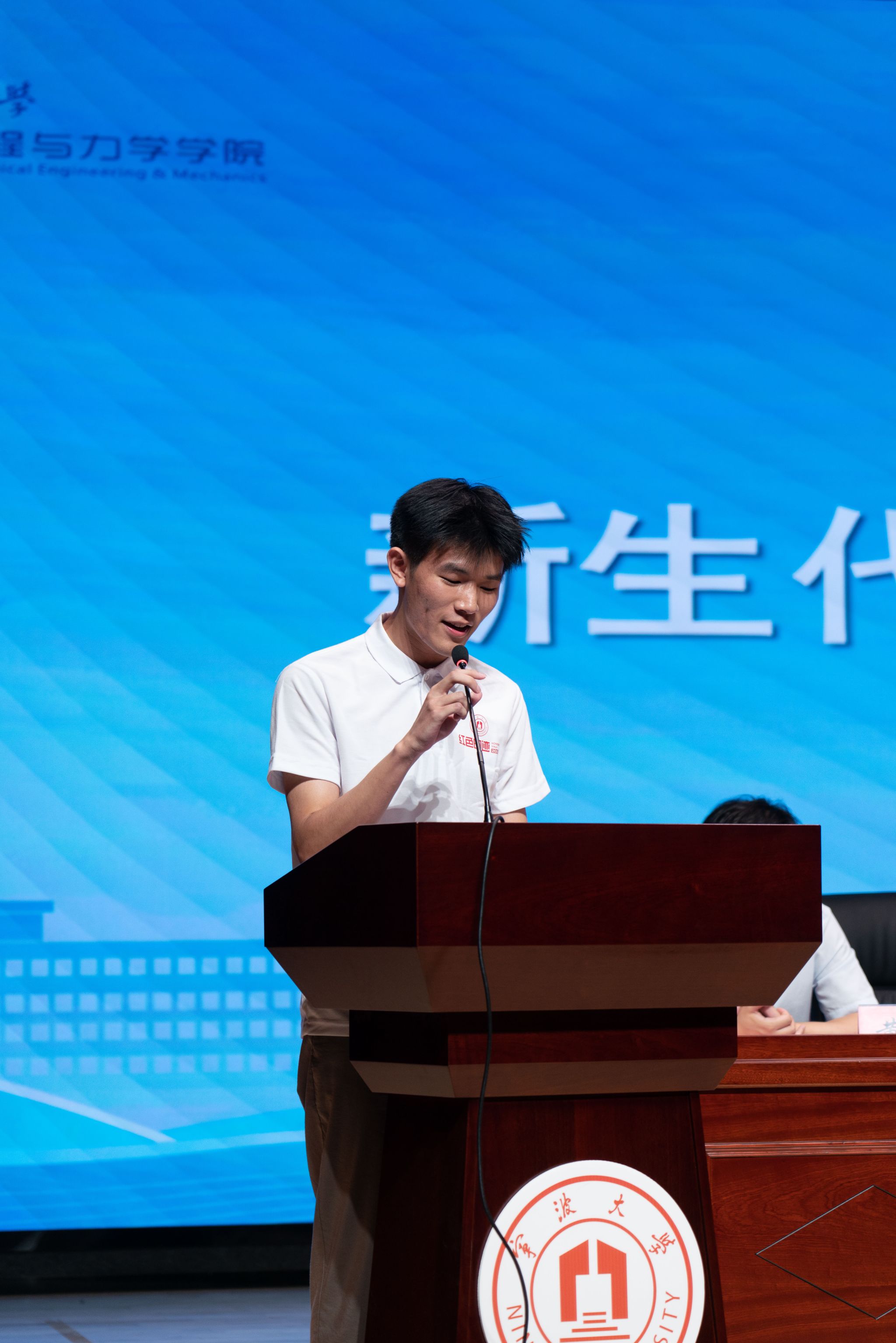 紧接着,来自213工程力学(拔尖人才创新班)的班长王瑞和来自237机械国贸班的班长邹子龙作为新老生代表分别上台发言。王瑞以自己的亲身经历为例,向分流新生们传授了学习方法和生活经验,鼓励他们在大学期间全面发展自己。邹子龙则表达了对大学生活的期待和憧憬,表示将珍惜机会,努力学习,为学院争光。
