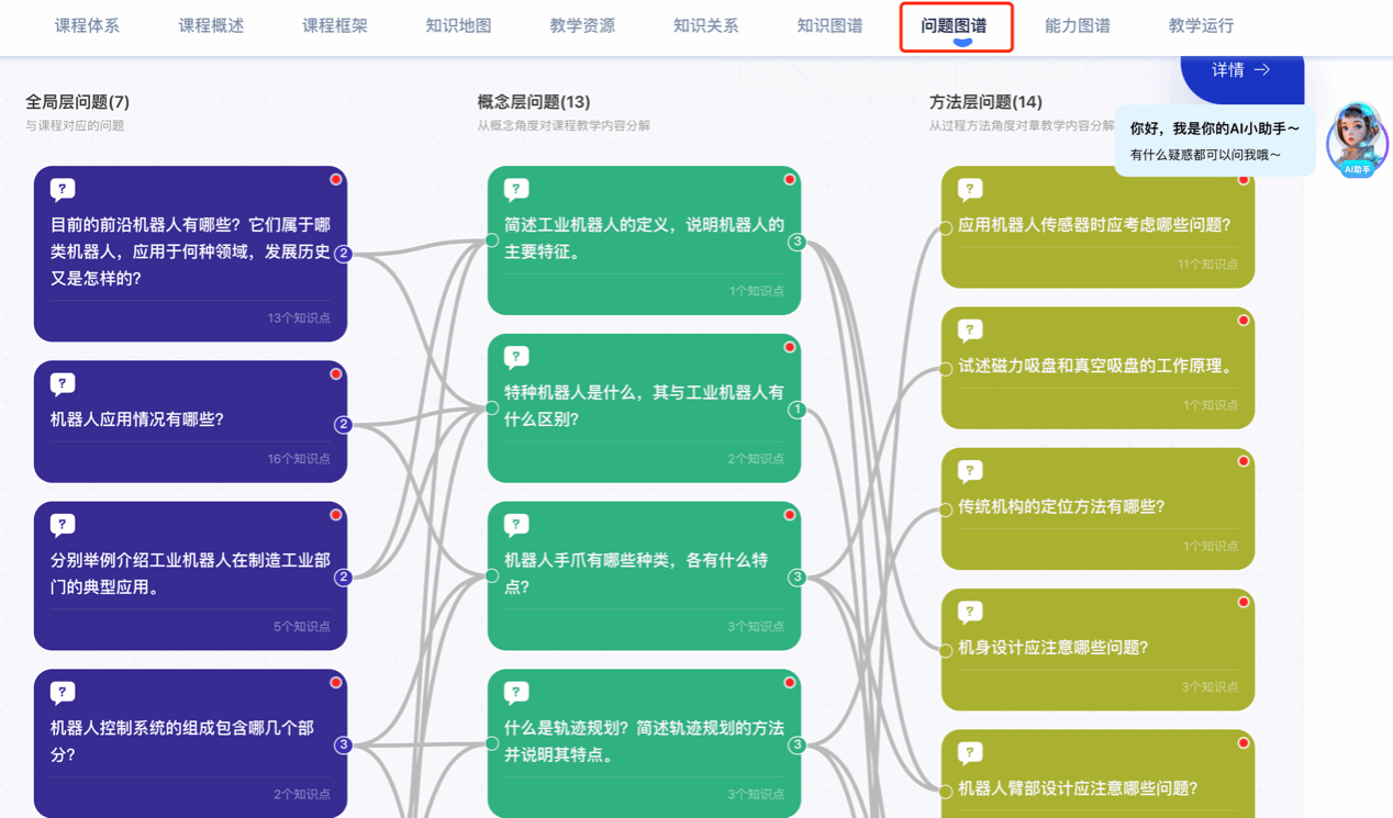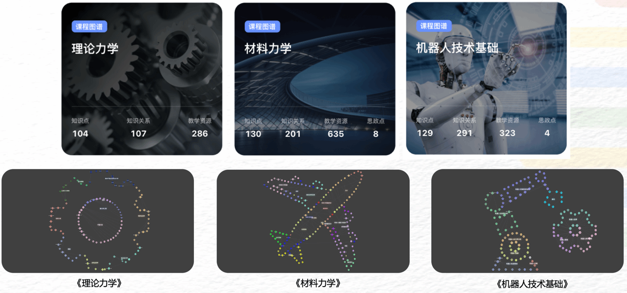 将人工智能与教学内容深度融合,首批建设《理论力学》、《材料力学》、《机器人技术基础》 等3门知识图谱AI课程,通过对课程知识点进行体系化梳理,形成完整的知识结构体系,并与课程特色相结合,进行可视化呈现。该课程体系不仅涵盖了机械工程与力学领域的核心理论和应用技术,还通过智能化的教学手段,提高了教学效率和学生的学习兴趣.