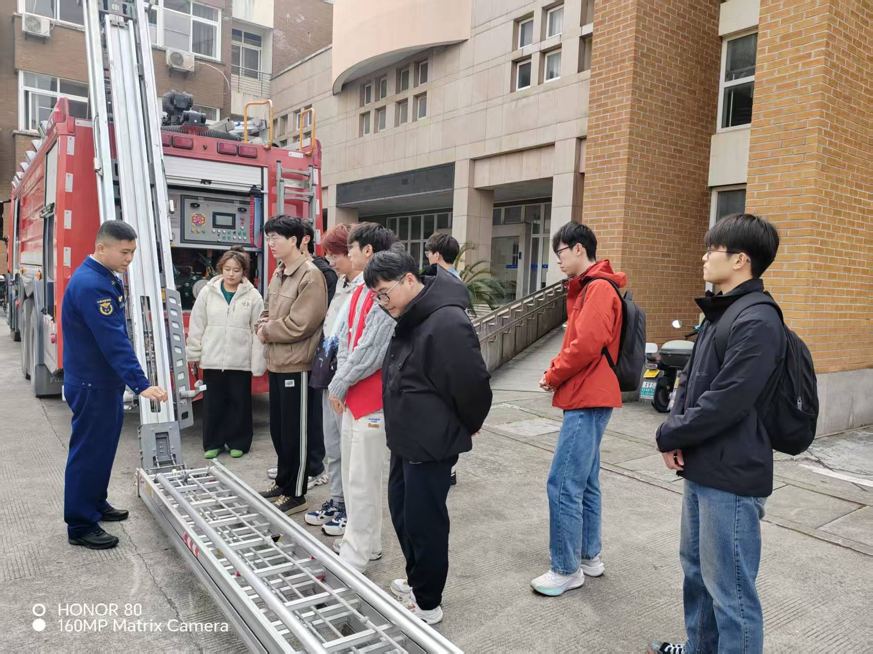 活动期间,为了提升安全教育活动的专业性、知识性和趣味性,在白沙救援站的大力支持下,同学们有幸近距离观察应急消防车辆,详细了解其外部结构构造和具体功能使用等,以及所具有的消防器械研发价值。同时,现场还开展了灭火器使用演练活动。