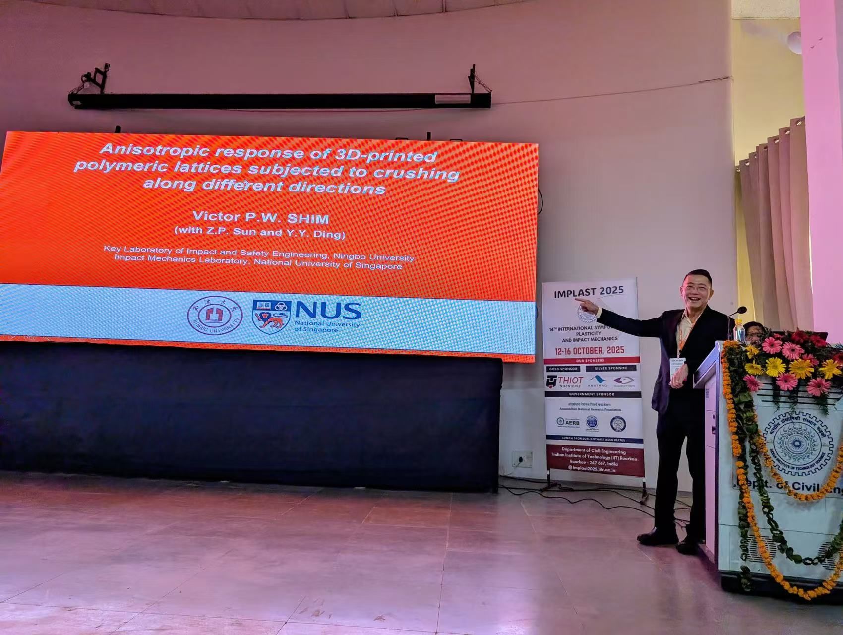 本次大会上,学院希姆教授(Prof. Victor Shim)作为八位受邀海外大会主题报告人之一,代表学校发表重要学术报告。希姆教授以“增材制造聚合物点阵结构在不同方向压缩下的各向异性响应”(Anisotropic response of additively-manufactured polymeric lattices to compression along different directions)为题,系统展示了其与孙正平博士、丁圆圆副教授合作完成的前沿研究成果。报告内容聚焦国际学术热点,现场反响热烈。报告环节由国际冲击工程领域顶级期刊《International Journal of Impact Engineering》主编Magnus Langseth教授亲自主持。Langseth教授对希姆教授的研究给予高度评价,称赞该工作在实验设计、理论分析与计算建模三者间实现了“完美的平衡”。多位与会学者亦对报告内容予以积极反馈,并诚挚邀请希姆教授在明年于其他国家举办的相关会议上再度进行学术分享。本次会议汇聚了该期刊多位副主编在内的国际知名学者,为宁波大学提供了展示学术实力的高端平台。通过此次报告,希姆教授充分展现了宁波大学在冲击力学与材料动力学行为研究方面的突出成果,有效提升了学校在国际相关学术领域的显示度与影响力。