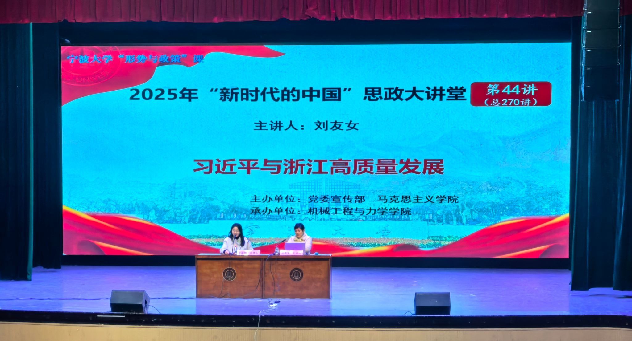 12月3日,机械工程与力学学院在林杏琴会堂举办“新时代的中国”思政大讲堂第44讲暨形势与政策课专题讲座。本次讲座特邀马克思主义学院刘友女教授担任主讲,围绕“习近平与浙江高质量发展”这一主题,为学院师生带来了一场内容详实、思想深刻的专题辅导。讲座由学院党委副书记沈妍伶主持。