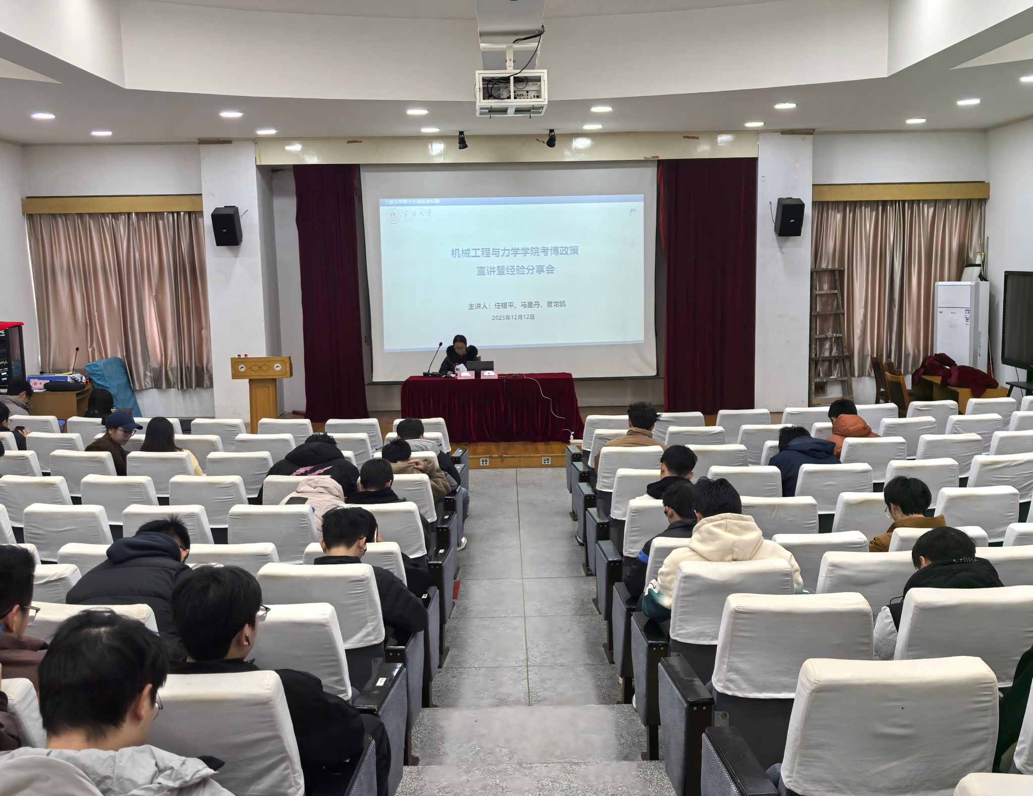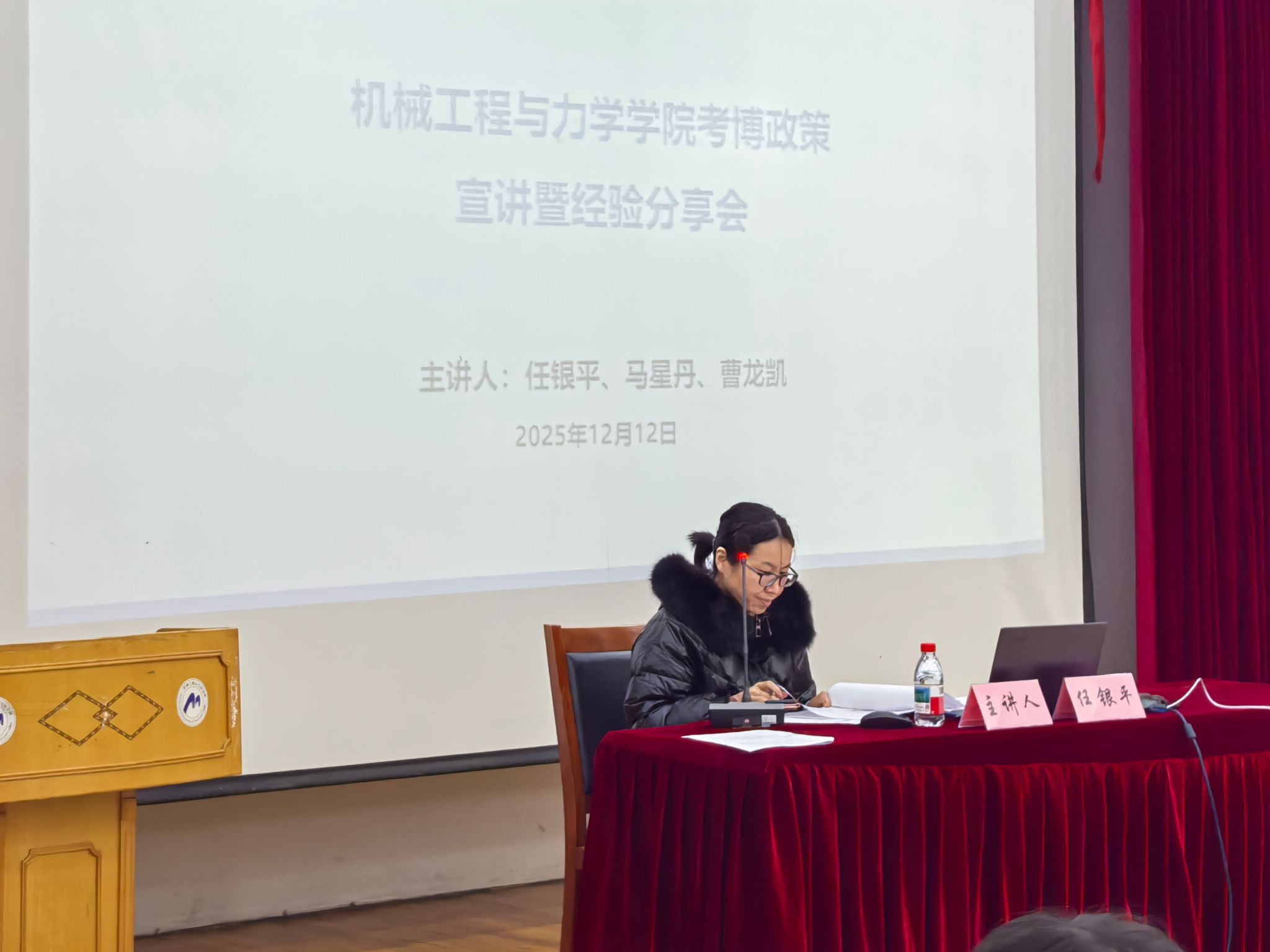 为进一步宣传学校和学院2026年的考博政策,强化学术氛围,助力研究生明晰深造规划、掌握备考策略,12月12日上午9点30分,机械学院在绣山工程楼三楼举行考博政策宣讲暨经验分享会,会议邀请研究生办主任任银平老师做政策宣讲,博士生马星丹、曹龙凯同学分享自身考博经验,共150余名研究生参会。