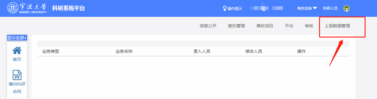 主要涉及到2023年新立项的科研项目,请各位老师登录科研服务管理平台及时维护上报数据,在系统首页点击上报数据管理,维护2023年新立科研项目的相关学科信息、服务的国民经济行业、社会经济指标、R&D活动类型和投入的人年数、博士生硕士生人数等数据。