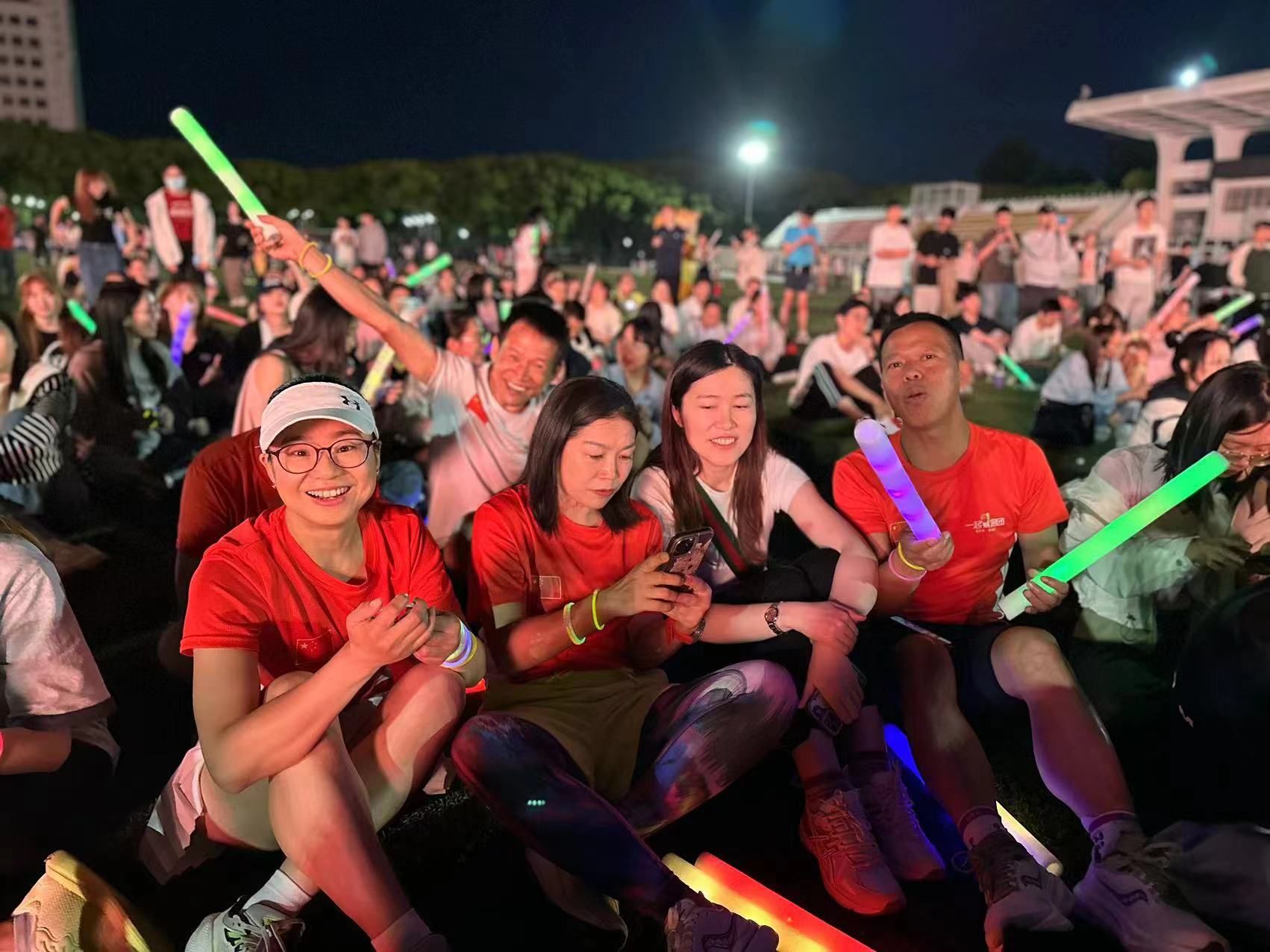 活动现场,十余位校友们与在校同学们欢聚一堂,共同感受这份特别的校园情怀。夜跑现场搭建了音乐舞台,精彩节目轮番上演,校友们纷纷席地而坐,跟随着节奏与同学们一起挥舞着荧光棒。现场气氛热烈,掌声与欢呼声此起彼伏。还有的校友们带来了“宁二代”,小朋友们与“奥特曼”大队、学院吉祥物马里奥玩作一团,参与田径场内的游戏互动,踢毽子、猜人名,感受着快乐的宁大氛围。