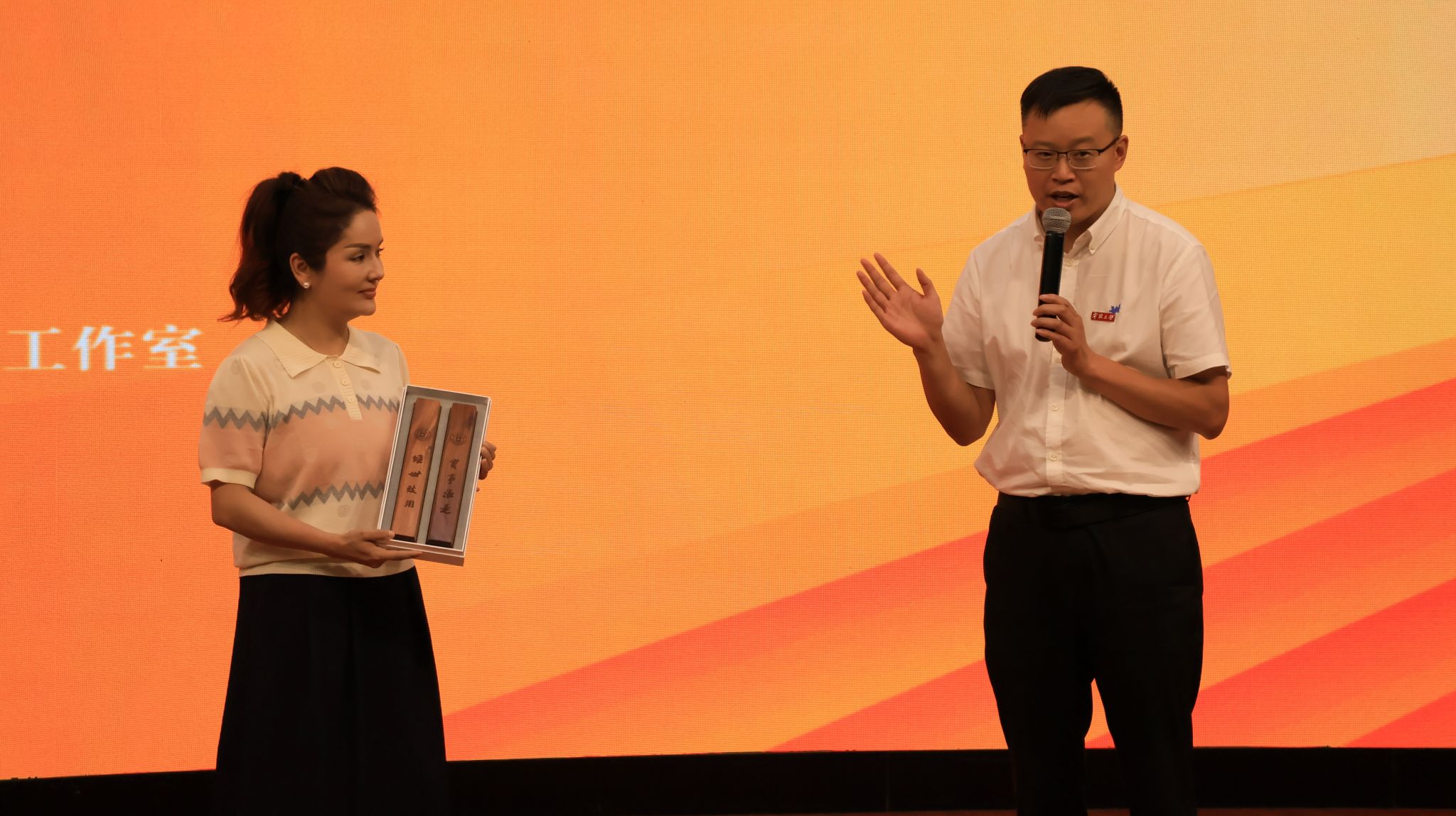 课堂尾声,米娜老师当年的辅导员,现任宁波大学学生处副处长张海华老师,代表学校向她赠送了一份特殊的纪念:一方镌刻着宁大校训的镇纸。这份礼物,不仅是对米娜校友反哺母校的敬意,更象征着宁大精神在代际间的郑重传递。张海华副处长同时也为全体2025届毕业生送上了真挚的祝福,期盼学子们行稳致远。