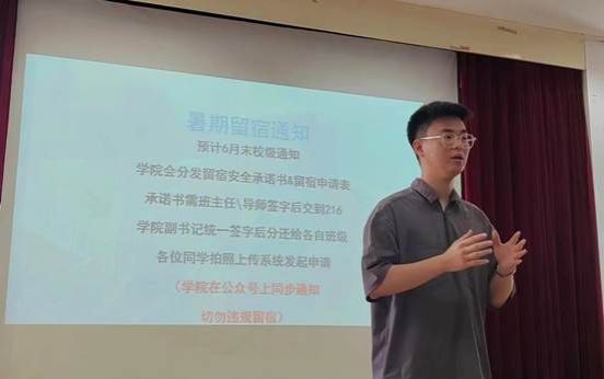 会议议程主要分四项进行,分别是:1.暑期离校、留宿注意事项通知;2.本学期宿舍卫生检查不合格及违规安全行为通报;3.优秀个人和团体表彰仪式;4.下学期活动安排和预告。