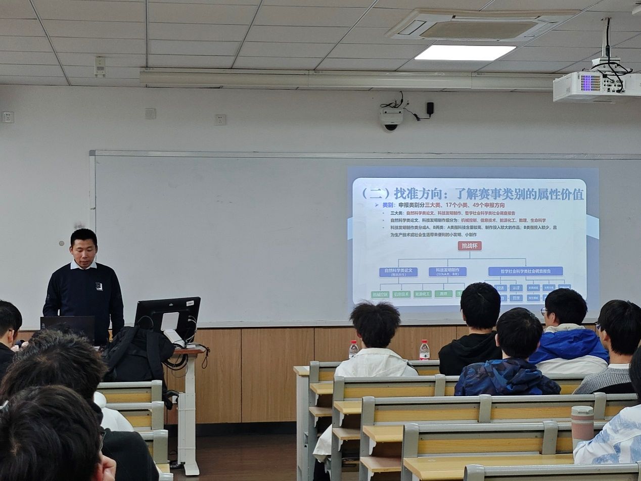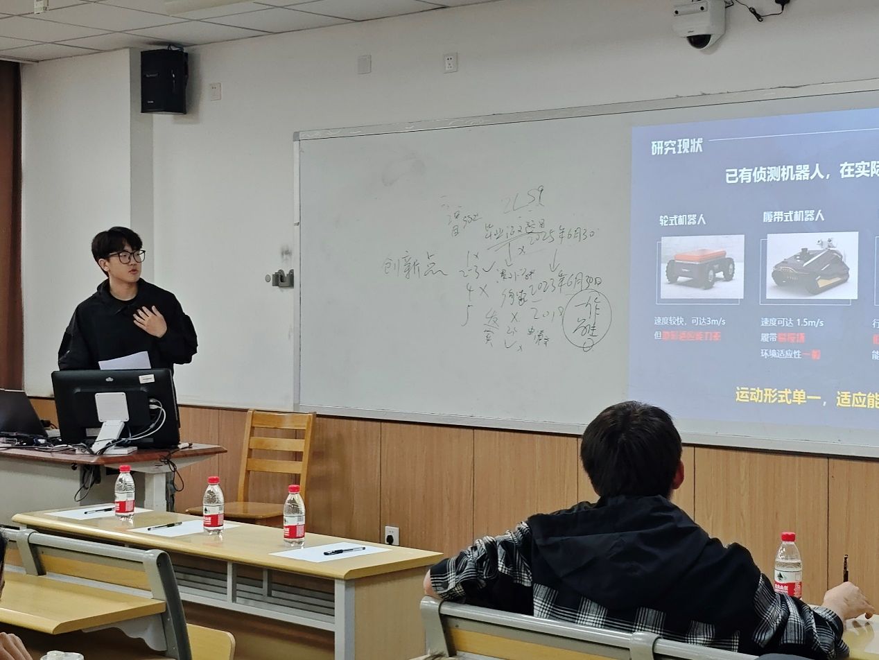 近期我校第十一届“挑战杯”大学生课外学术科技作品竞赛通知发布,为了让更多备赛师生把握比赛导向、了解比赛规则、掌握备赛方法,2024年10月30日下午,机械工程与力学学院举办“绣山训练营”系列活动之“挑战杯”大学生课外学术科技作品竞赛备赛动员会。学院邀请了往届国赛、省赛获奖项目作展示分享,并邀请国赛获奖团队指导教师洪松老师分享如何备赛。活动伊始,洪松老师对“挑战杯”比赛进行了全面讲解,细致分析了规则要求、评审标准,强调了挑战杯对于培养学生创新能力和实践能力的重要意义,鼓励同学们积极参与,并针对比赛中常见的问题和注意事项给予了宝贵建议,使同学们对挑战杯有了更清晰、深入的认识。随后,蒋镇孺和张嘉泽分别代表《银光科技——电喷打印式高性能太阳能电池片开拓者》、《“蜘蛛侦探”--应用于复杂环境救援侦测的滚爬一体式智能机器人的研制》项目作分享。从项目选题、团队组建、方案设计到实践调研,展示了优秀项目的创新点和亮点,使同学们了解了赛事呈现的底层逻辑。此外,两位同学还分享了在比赛过程中的经验和心得,包括如何应对突发情况、如何与团队成员有效沟通等。根据前期排摸学院项目团队资源与需求、同学们参赛意愿,为充分对接双方需求,选拔综合素质突出、参赛积极性较高的队员,活动特地设置“项目-参赛人”对接环节。预报名项目团队负责人依次上台,介绍项目背景、目标、当前进展以及所需人才要求等,不少感兴趣的同学纷纷提交简历,与项目团队深入交流、增进了解。自校赛通知发出后,学院高度重视,部署相关工作推介大赛、动员备赛。师生参赛热情也十分高涨,目前已有20余支项目团队、近200人参加预报名。下步学院拟举办院赛,选拔优质项目,为校赛做好准备。