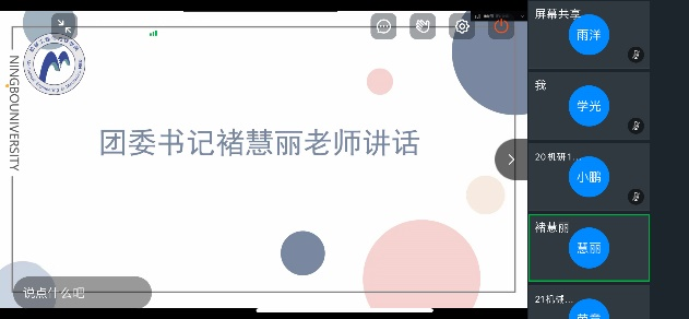 由于疫情影响,邀请团委书记褚慧丽线上发表讲话,褚书记对研会、研会成员以及全体研究生同学提出几点希望,她要求研究生会要找准组织定位,明确组织职能;全体研究生同学既要着眼当下,又要目光长远,积极应对未来的各种挑战。校研会代表曹越同学线上发表讲话并对本次大会顺利召开表示祝贺。