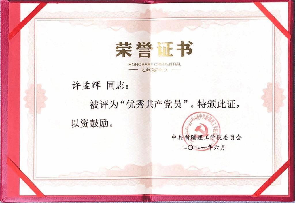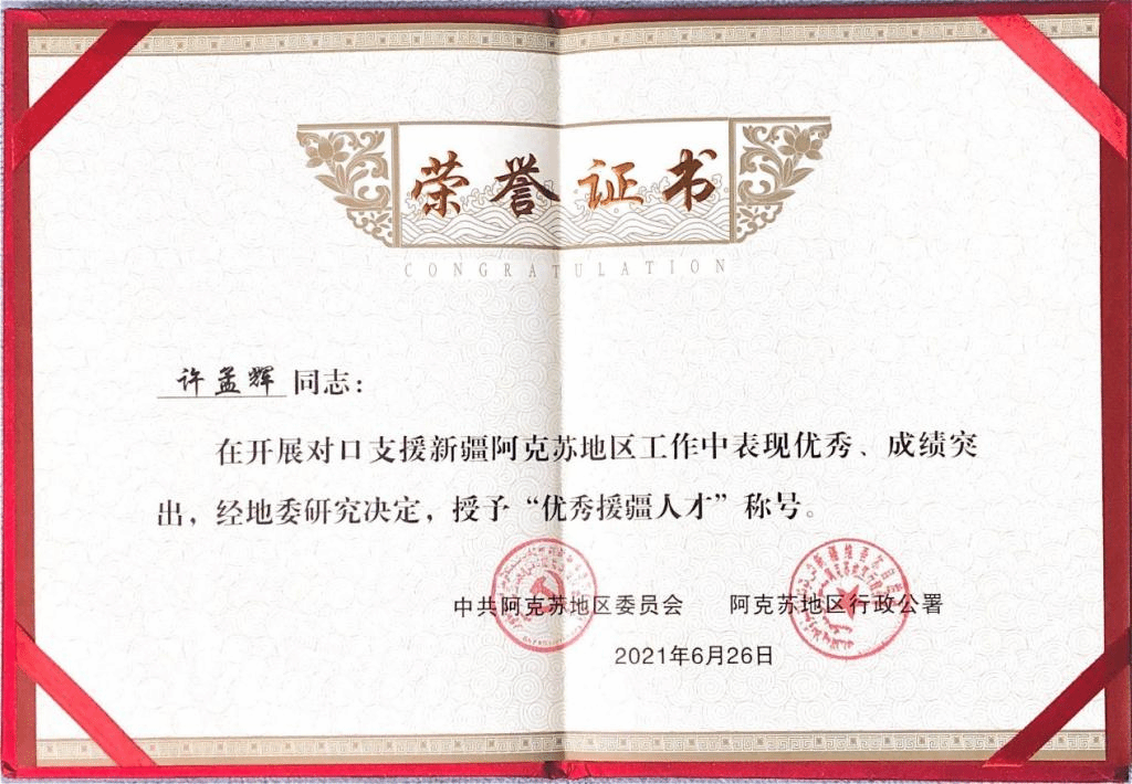 许孟辉同志荣获中共阿克苏地区委员会、阿克苏地区行政公署“优秀援疆人才”,浙江省对口支援新疆阿克苏地区和兵团第一师指挥部委员会“团结协作优秀个人”,中共新疆理工学院委员会“杰出贡献奖”、“优秀共产党员”、属地管理“优秀教职工”等荣誉称号。