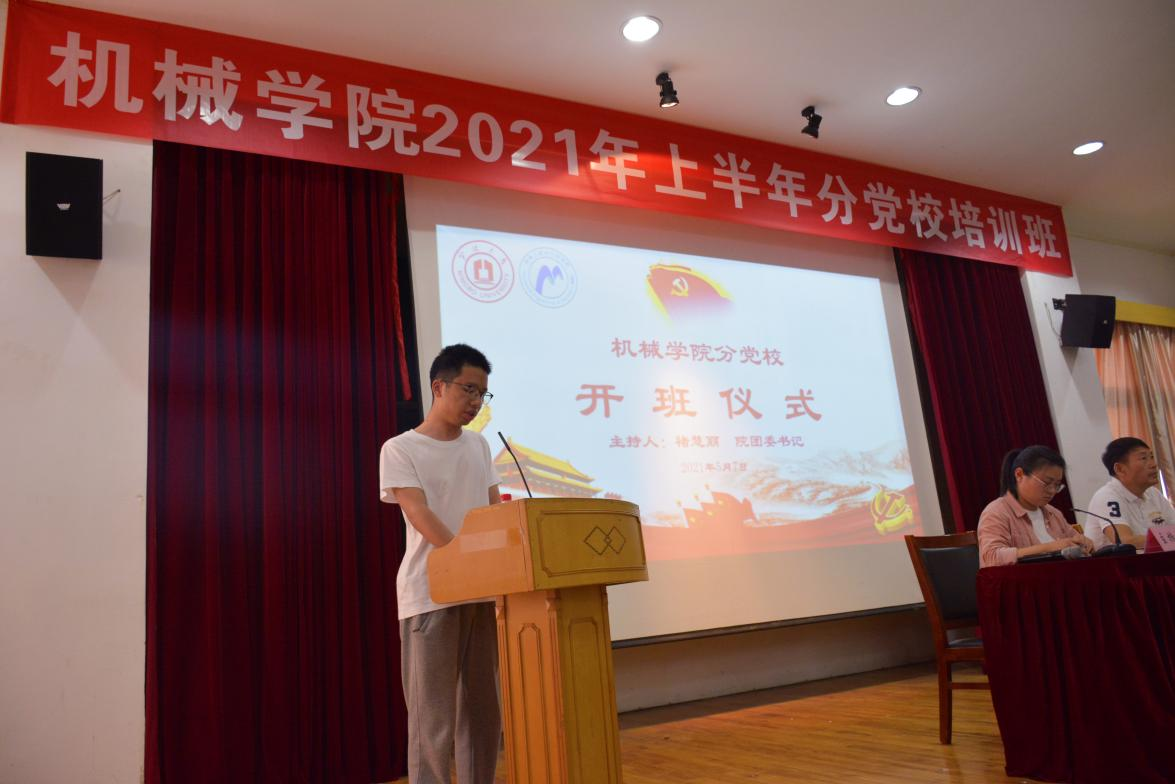 学生入党的培训工作,深化党的基本理论知识的学习及教育,同时为更好贯彻落实党史学习教育要求,引导广大党员学史明理、学史增信、学史崇德、学史力行,5月7日,机械学院在绣山工程楼三楼报告厅举行第24期预备党员培训班、第9期发展对象、第31期入党积极分子培训班开班仪式,学院党委书记胡泓、专职组织员张勇、团委书记褚慧丽、各学生党支部书记和本期党校学员参加了开班仪式,会议由褚慧丽主持。