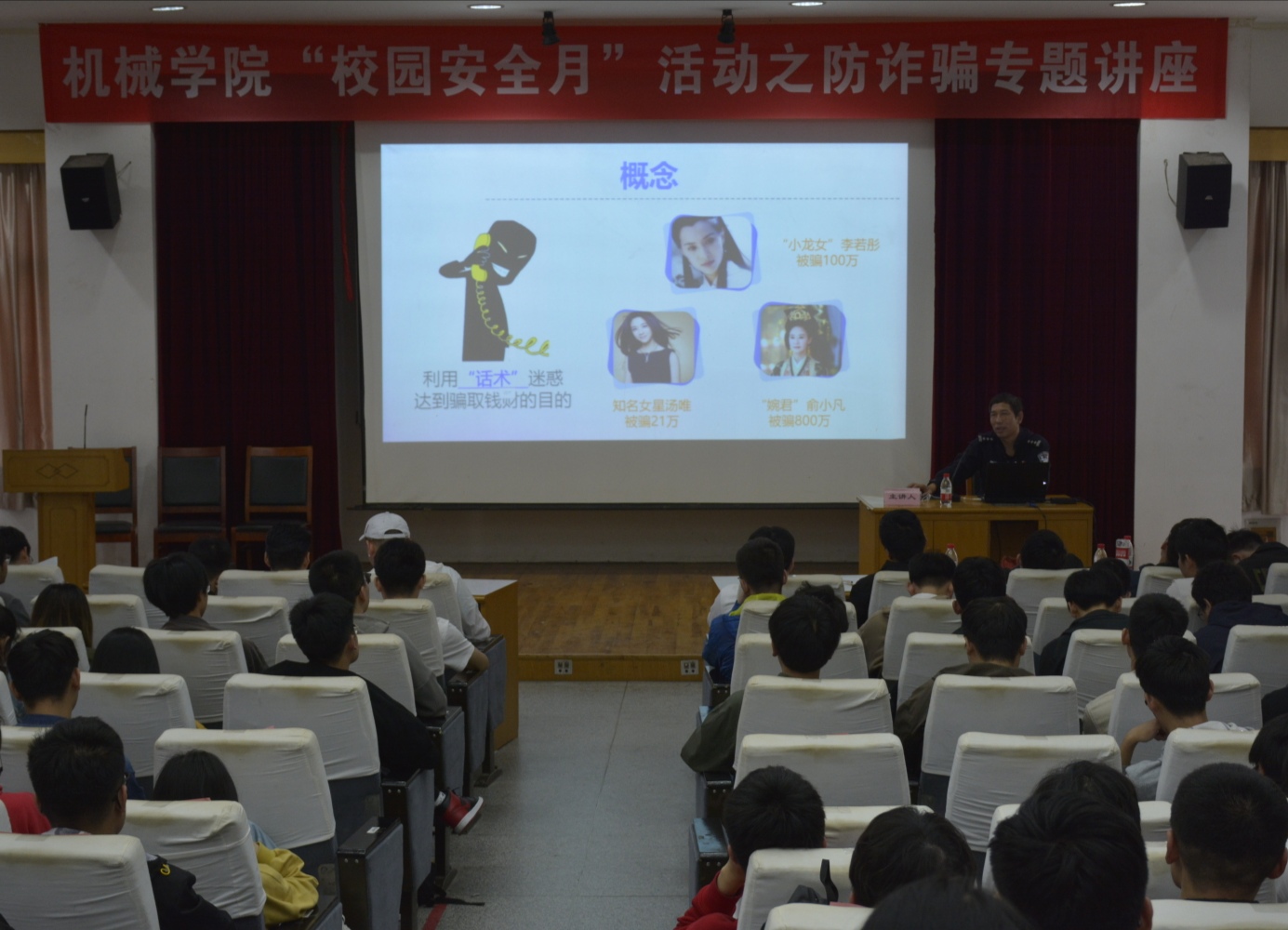 “校园安全月”活动之防诈骗讲座在绣山工程楼三楼报告厅成功举办。文苑派出所秦四宽警官作为特邀嘉宾,给同学们上了一堂内容充实、案例丰富、技巧实用的防诈骗安全讲座,全体学生干部进行了聆听,讲座由学工办张万兵老师主持。