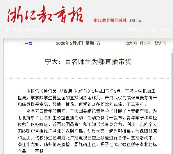 此前,机械学院洪松、夏旦丽等4名师生还积极参与,“青春有我,为湖北拼单”百名宁大师生公益直播活动,事迹受到学习强国、《浙江教育报》、浙江新闻客户端、宁波日报、钱江晚报、宁波晚报、中国宁波网、凤凰网、宁波市人民政府等多家主流媒体和政府部门报道关注。