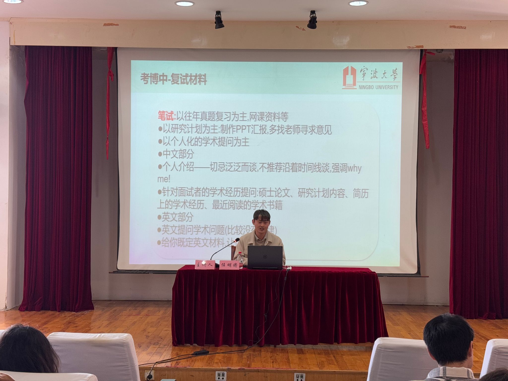 紧接着,任明将同学带着他的考博故事和宝贵经验,走上了分享的讲台。“为什么读博?”——学长用自己的亲身经历,告诉我们追求学术的初心和信念。“要有一个坚定的理由,哪怕是单纯希望工资高一些,不然过程会很痛苦!”因为,读博的道路充满了挑战与艰辛,如果没有一个坚定的理由支撑,那么这个过程可能会变得异常痛苦和难以坚持。所以,无论大家的信念是什么,让它成为你前行的灯塔,照亮你在学术探索中的每一个黑暗时刻,让这个信念成为自身不断前进的动力,最终引领自己走向成功的彼岸。