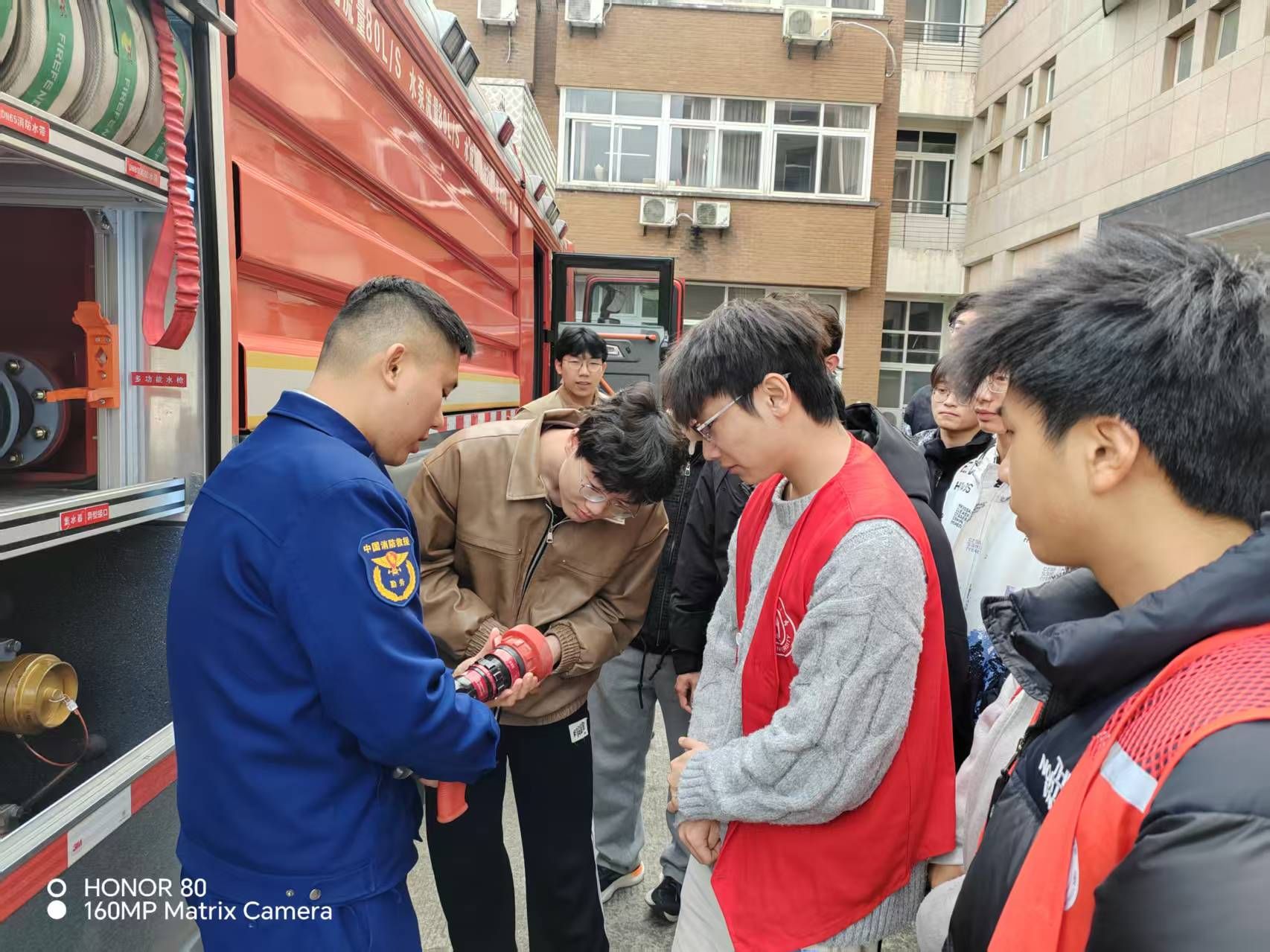 活动期间,为了提升安全教育活动的专业性、知识性和趣味性,在白沙救援站的大力支持下,同学们有幸近距离观察应急消防车辆,详细了解其外部结构构造和具体功能使用等,以及所具有的消防器械研发价值。同时,现场还开展了灭火器使用演练活动。