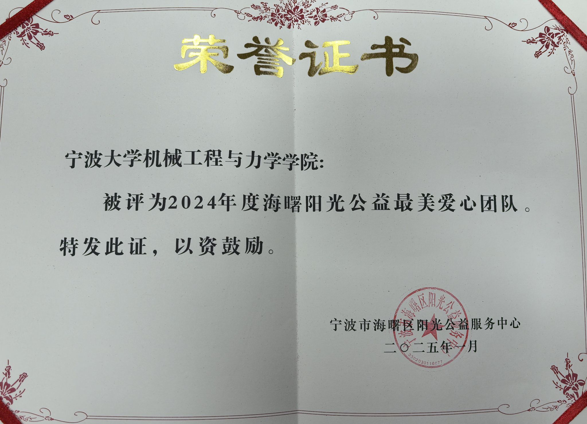 被评为2024年度海曙阳光公益最美爱心团队,自2021年3月学院与海曙阳光公益合作建立首个党员青年志愿服务实践基地以来,多次联合开展红色古道环保公益行、国庆平安引导等主题党日活动。