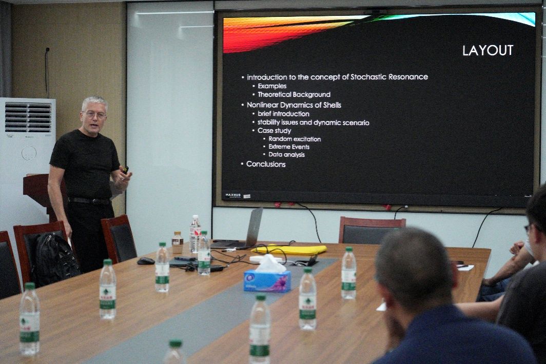 6月11日下午,意大利摩德纳—雷焦·艾米里亚大学Francesco Pellicano教授受邀来访51吃瓜网 极端环境交叉力学研究所,在龙赛理科楼南楼519会议室,为学院师生带来一场题为“Stochastic Resonances”的学术报告。报告由林骥研究员主持,学院相关专业师生积极参与交流学习。 Francesco Pellicano教授从实证与理论双重视角深入浅出地阐述了随机共振的概念。他围绕“简介概述”“稳定性问题和动态场景”及“案例分析”三个部分,重点探讨了壳体的非线性动力学特性。通过实验演示,教授生动展示了壳体结构在不同环境条件下出现的复杂动态现象,并揭示了尖峰振荡的内在规律——其频谱内容与结构自然频率高度匹配,衰减模式亦类似自由结构振荡的瞬态响应。与会师生反响热烈,认为报告内容详实、启发性强。此次报告不仅拓宽了大家的学术视野,也为师生间的交流互动搭建了宝贵平台。(图文:李琼 极端环境交叉力学研究所)