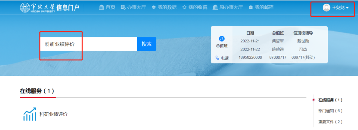 按照《宁大政[2021]93号文件》文件精神,学校开发完成科研业绩评价系统。在职教师信息门户登录后,搜索“科研业绩评价”点击就可以进入本系统,如下图: