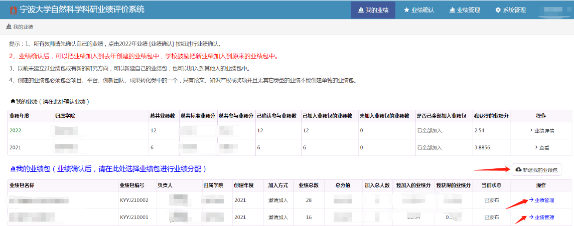 本人的科研业绩确认完成后,就可以进行业绩包的创建,也可以加入到自己或者别人创建的业绩包中。
